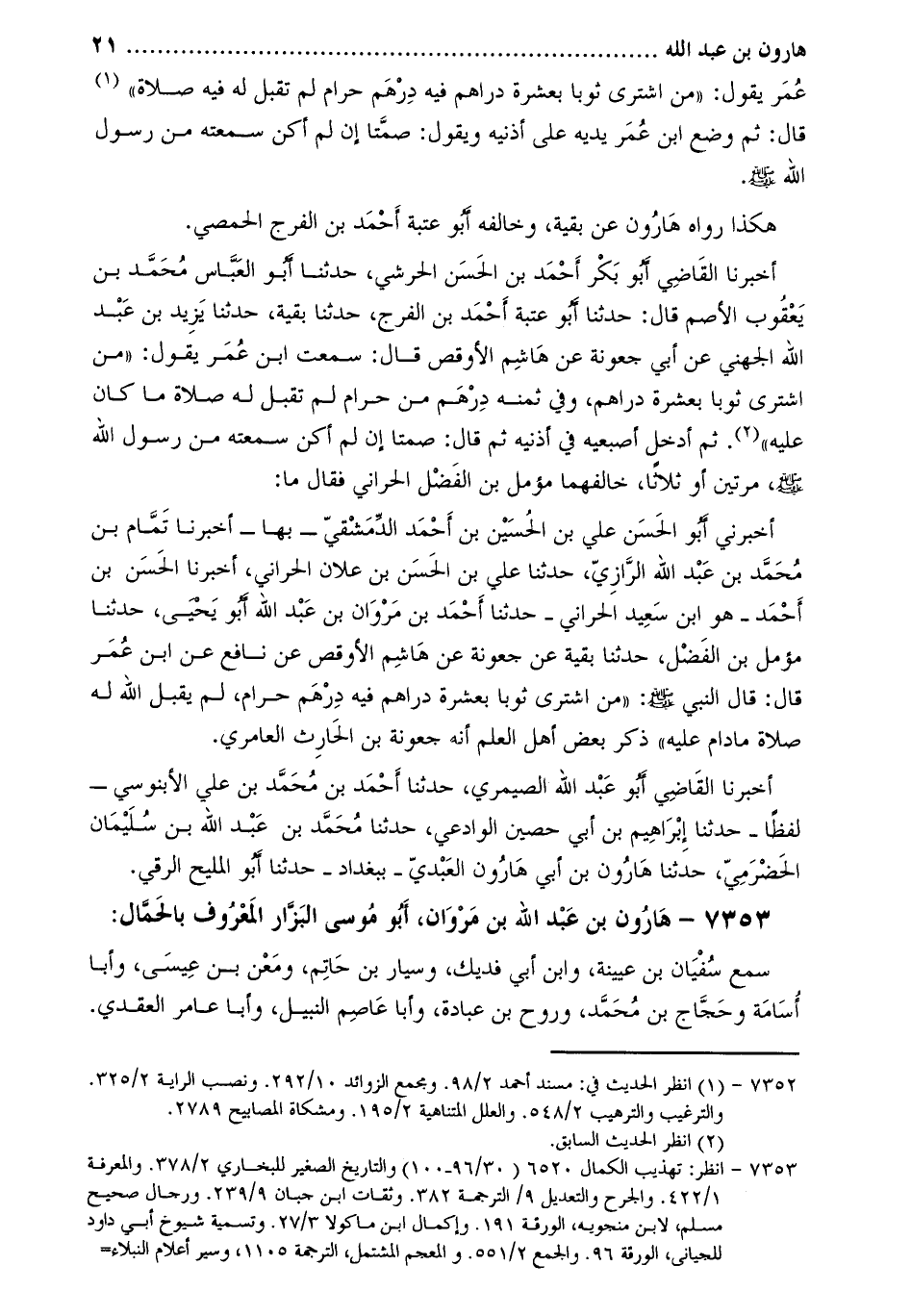أَخْبَرَنِي أَبُو الْحَسَن عَلِيُّ بْنُ الْحُسَيْن بْنِ أَحْمَد الدّمشقي- بها- أَخْبَرَنَا تَمَّامُ بْن مُحَمَّد بْن عَبْد اللَّه الرَّازِيُّ، حَدَّثَنَا عَلِيّ بْن الْحَسَن بْن عَلانَ الْحَرَّانِيُّ، أَخْبَرَنَا الْحَسَنُ بْنُ أَحْمَدَ- هُوَ ابْنُ سَعِيدٍ الحراني- حَدَّثَنَا أَحْمَدُ بْن مَرْوَان بْن عَبْد اللَّهِ أَبُو يَحْيَى، حدثنا مؤمل بن الفضل، حَدَّثَنَا بَقِيَّةُ عَنْ جَعْوَنَةَ عَنْ هَاشِمٍ الأَوْقَصِ عَنْ نَافِعٍ عَنِ ابْنِ عُمَرَ قَالَ: قَالَ النَّبِيُّ صَلَّى اللَّهُ عَلَيْهِ وَسَلَّمَ: «مَنِ اشْتَرَى ثَوْبًا بِعَشَرَةِ دَرَاهِمَ فِيهِ دِرْهَمٌ حَرَامٌ، لَمْ يَقْبَلِ اللَّهُ لَهُ صَلاةً مَا دَامَ عَلَيْهِ»