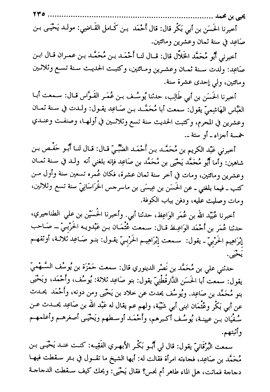 أَخْبَرَنَا الْحَسَن بْن أَبِي بَكْر قَالَ: قَالَ أَحْمَد بْن كامل القاضي: مولد يَحْيَى بْن صاعد فِي سنة ثَمان وعشرين ومائتين.