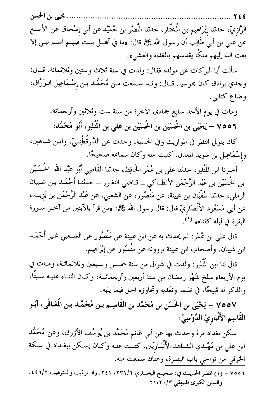 7556- يحيى بن الحسين بن الحسين بْن عَلِيّ بْن المنذر، أَبُو مُحَمَّد: