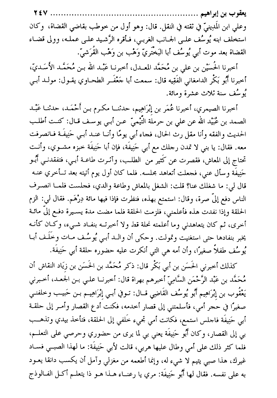 كذلك أَخْبَرَنِي الْحَسَن بْن أَبِي بَكْر قَالَ: ذكر مُحَمَّد بْن الْحَسَن بْن زياد النقاش أن مُحَمَّد بْن عَبْد الرَّحْمَن السامي أخبرهم بهراة قَالَ: أَخْبَرَنَا عَلِيّ بْن الجعد، أَخْبَرَنِي يعقوب بْن إِبْرَاهِيم أَبُو يوسف القاضي قَالَ: تُوُفِّيَ أبي إِبْرَاهِيم بْن حبيب وخلَّفني صغيرًا فِي حجر أمي، فأسلمتني إلى قصَّار أخدمه، فكنتُ أدع القصار وأمرُّ إلى حلقة أبي حنيفة فأجلس أستمع، فكانت أمي تجيء خلفي إلى الحلقة، فتأخذ بيدي وتذهب بي إلى القصار، وكان أَبُو حنيفة يعنى بي لما يرى من حضوري وحرصي عَلَى التعلم، فلما كثر ذَلِكَ عَلَى أمي وطال عليها هربي، قَالَتْ لأبي حنيفة: ما لِهذا الصبي فسادٌ غيرك، هذا صبي يتيم لا شيء لَهُ، وإنما أطعمه من مغزلي وآمل أن يكسب دانقًا يعود بِهِ عَلَى نفسه. فقال لَهَا أَبُو حنيفة: مُري يا رعناء هذا هُوَ ذا يتعلم أكل الفالوذج