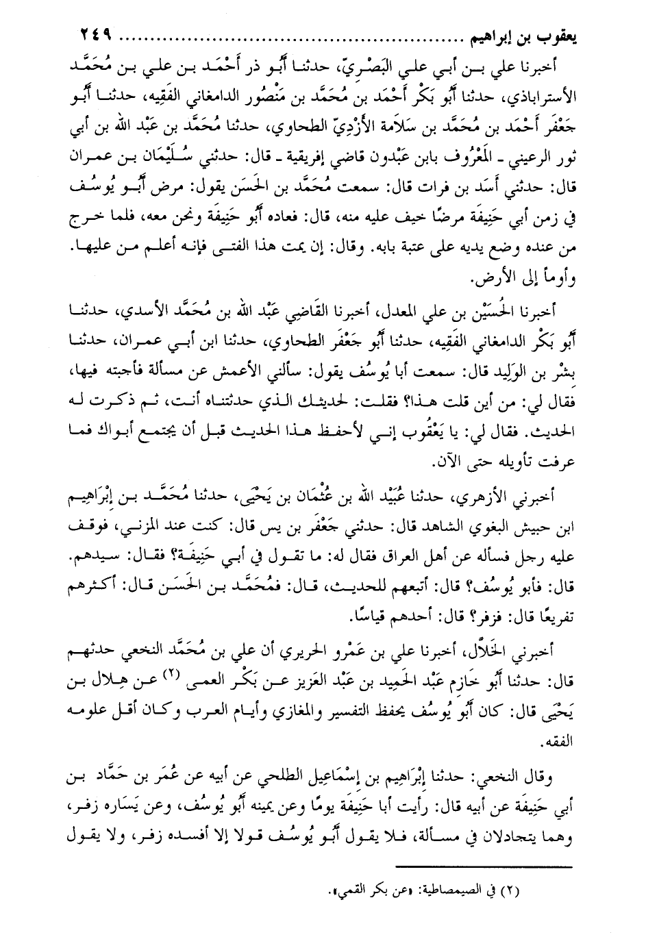 أخبرنا علي بن أبي علي البصريّ، حَدَّثَنَا أَبُو ذر أَحْمَد بْن علي بْن محمّد الأستراباذي، حَدَّثَنَا أبو بكر أحمد بن محمد بن منصور الدامغاني الفقيه، حَدَّثَنَا أَبُو جَعْفَر أَحْمَد بْن مُحَمَّد بْن سَلامَة الأزديّ الطحاوي، حدثنا محمد بن عبد الله بن أبي ثَوْر الرعيني- المعروف بابن عبدون قاضي إفريقية- قَالَ: حدَّثَنِي سُلَيْمَان بْن عمران قَالَ: حدَّثَنِي أسد بْن فُرات قَالَ: سمعتُ مُحَمَّد بْن الْحَسَن يَقُولُ: مرض أَبُو يوسف فِي زمن أبي حنيفة مرضًا خيف عَلَيْهِ منه، قَالَ: فعاده أَبُو حنيفة ونحنُ معه، فلما خرج من عنده وضع يديه عَلَى عتبة بابه. وقال: إن يمت هذا الفتى فإنه أعلمُ من عليها.