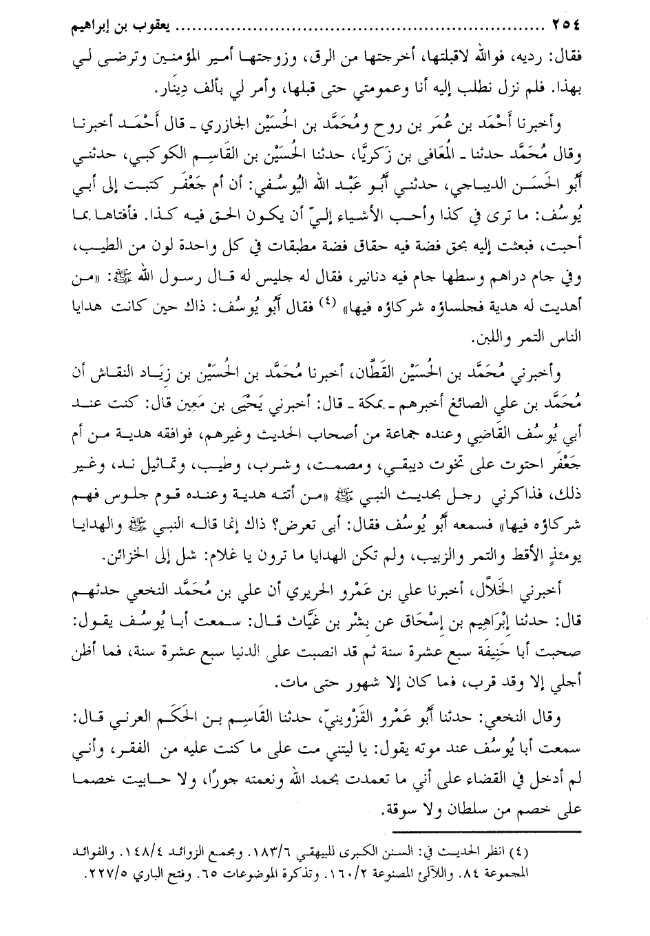 وأخبرني محمّد بن الحسين القطّان، أَخْبَرَنَا مُحَمَّدُ بْنُ الْحُسَيْنِ بْنِ زِيَادٍ النَّقَّاشُ أَنَّ مُحَمَّدَ بْنَ عَلِيٍّ الصَّائِغَ أَخْبَرَهُمْ- بِمَكَّةَ- قَالَ: أَخْبَرَنِي يَحْيَى بْنُ مَعِينٍ قَالَ: كُنْتُ عِنْدَ أَبِي يُوسُفَ الْقَاضِي وَعِنْدَهُ جَمَاعَةٌ مِنْ أصحاب الحديث وغيرهم، فوافقه هَدِيَّةٌ مِنْ أُمِّ جَعْفَرٍ احْتَوَتْ عَلَى تُخُوتٍ دَيْبَقِيٍّ، وَمُصْمَتٍ، وَشُرْبٍ، وَطِيبٍ، وَتَمَاثِيلَ نِدٍّ، وَغَيْرِ ذَلِكَ، فَذَاكَرَنِي رَجُلٌ بِحَدِيثِ النَّبِيِّ صَلَّى اللَّهُ عَلَيْهِ وَسَلَّمَ «مَنْ أَتَتْهُ هَدِيَّةٌ وَعِنْدَهُ قَوْمٌ جُلُوسٌ فَهُمْ شُرَكَاؤُهُ فِيهَا»