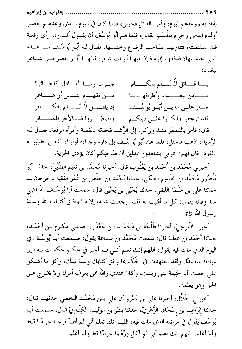 حَدَّثَنَا إِبْرَاهِيم بْن إسحاق الزّهريّ، حَدَّثَنَا بشر بْن الوليد الكندي قَالَ: سمعتُ أَبَا يوسف يَقُولُ فِي مرضه الَّذِي مات فِيهِ: اللَّهُمَّ إنك تعلم أني لم أطأ فرجًا حرامًا قط وأنا أعلم، اللَّهُمَّ إنك تعلم أني لم آكل درهمًا حرامًا قط وأنا أعلم.