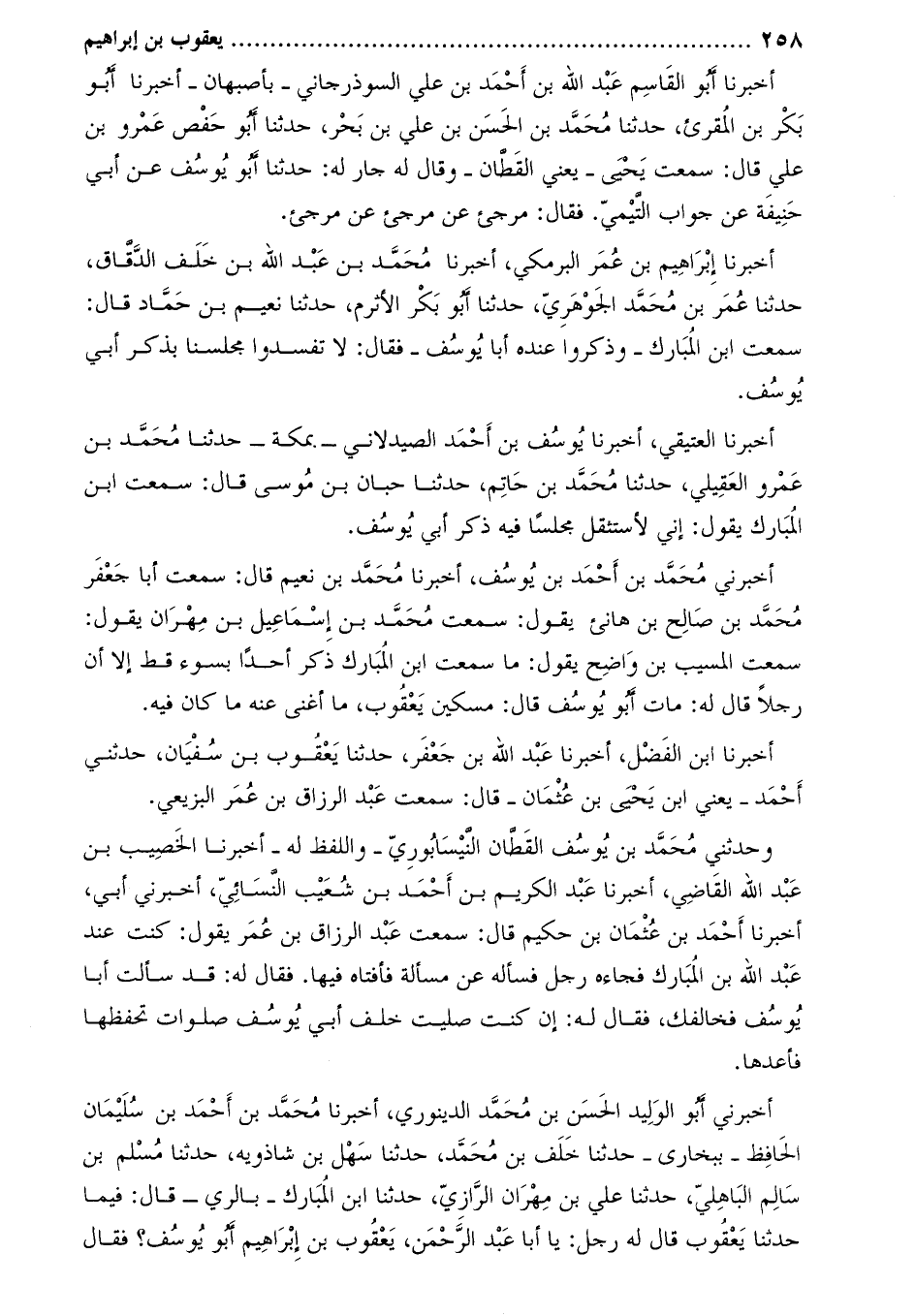 أَخْبَرَنِي أَبُو الوليد الْحَسَن بْن محمّد الدينوري، أَخْبَرَنَا مُحَمَّدُ بْنُ أَحْمَدَ بْنِ سُلَيْمَانَ الْحَافِظُ- ببخارى- حدثنا خلف بن محمّد، حدثنا سهل بن شاذويه، حدثنا مسلم بن سالم الباهليّ، حدثنا علي بن مهران الرّازيّ، حَدَّثَنَا ابن المبارك- بالري- قَالَ: فيما حَدَّثَنَا يعقوب قَالَ لَهُ رَجُل: يا أَبَا عَبْد الرَّحْمَن، يعقوب بْن إِبْرَاهِيم أَبُو يوسف؟ فقال