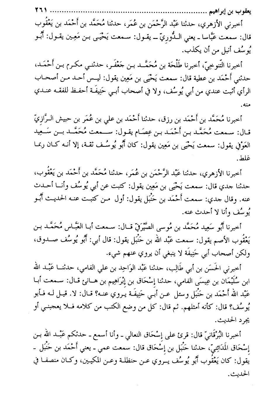 أخبرنا الأزهري، حدثنا عبد الرّحمن بن عمر، حدثنا محمّد بن أحمد بن يعقوب، حَدَّثَنَا جدي قَالَ: سَمِعْتُ يَحْيَى بْن معين يَقُولُ: كتبتُ عَن أبي يوسف وأنا أحدث عَنْهُ. وقال جدي: سَمِعْتُ أَحْمَد بْن حنبل يَقُولُ: أول من كتبت عَنْهُ الحديث أَبُو يوسف وأنا لا أحدث عَنْهُ.