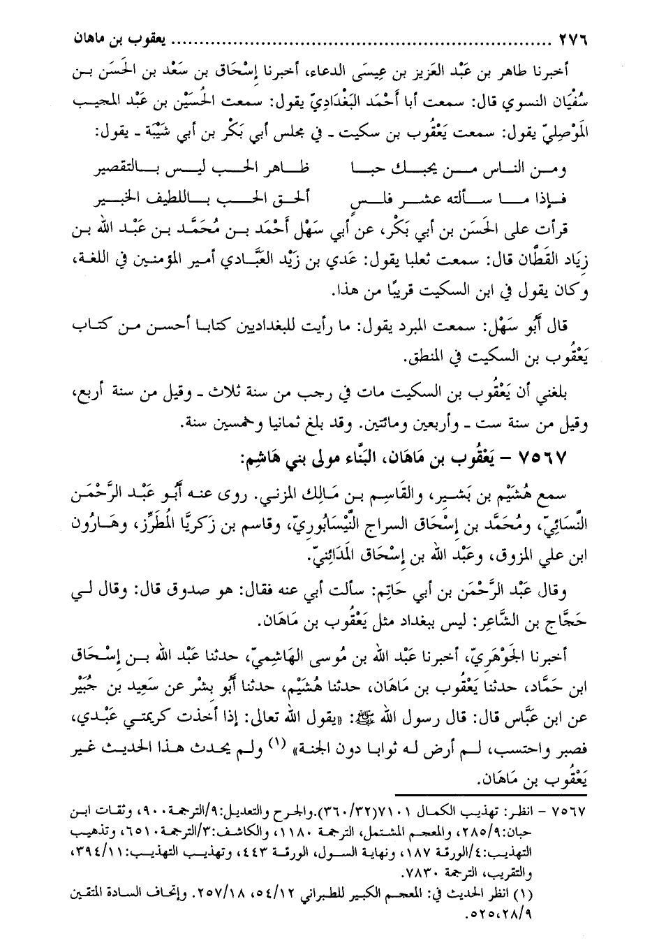 أَخْبَرَنَا طاهر بْن عَبْد العزيز بْن عيسى الدعاء، أَخْبَرَنَا إِسْحَاقُ بْنُ سَعْدِ بْنِ الْحَسَنِ بْنِ سُفْيَانَ النسوي قَالَ: سمعتُ أَبَا أَحْمَد البغدادي يَقُولُ: سمعتُ الْحُسَيْن بْن عَبْد المجيب الْمَوْصِليّ يقول: سمعت يعقوب بن سكيت- فِي مجلس أبي بَكْر بْن أبي شيبة- يَقُولُ: