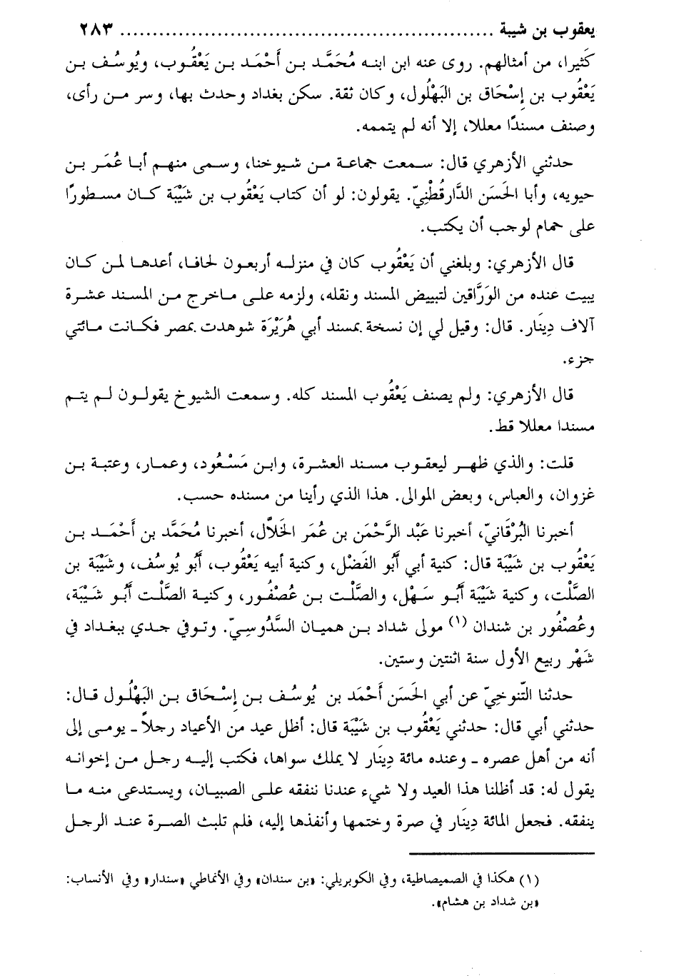 أخبرنا البرقانيّ، أخبرنا عبد الرّحمن بن عمر الخلّال، أَخْبَرَنَا محمد بن أحمد بن يعقوب بن شيبة قَالَ: كنية أبي أبو الفضل، وكنية أبيه يعقوب، أبو يوسف، وشيبة بن الصّلت، وكنية شيبة أبو سهل، والصّلت بن عصفور، وكنية الصّلت أبو شيبة، وعصفور بن شندان [1] مولى شداد بْن هميان السدوسي. وَتُوُفِّيَ جدي ببغداد فِي شهر ربيع الأول سنة اثنتين وستين.
