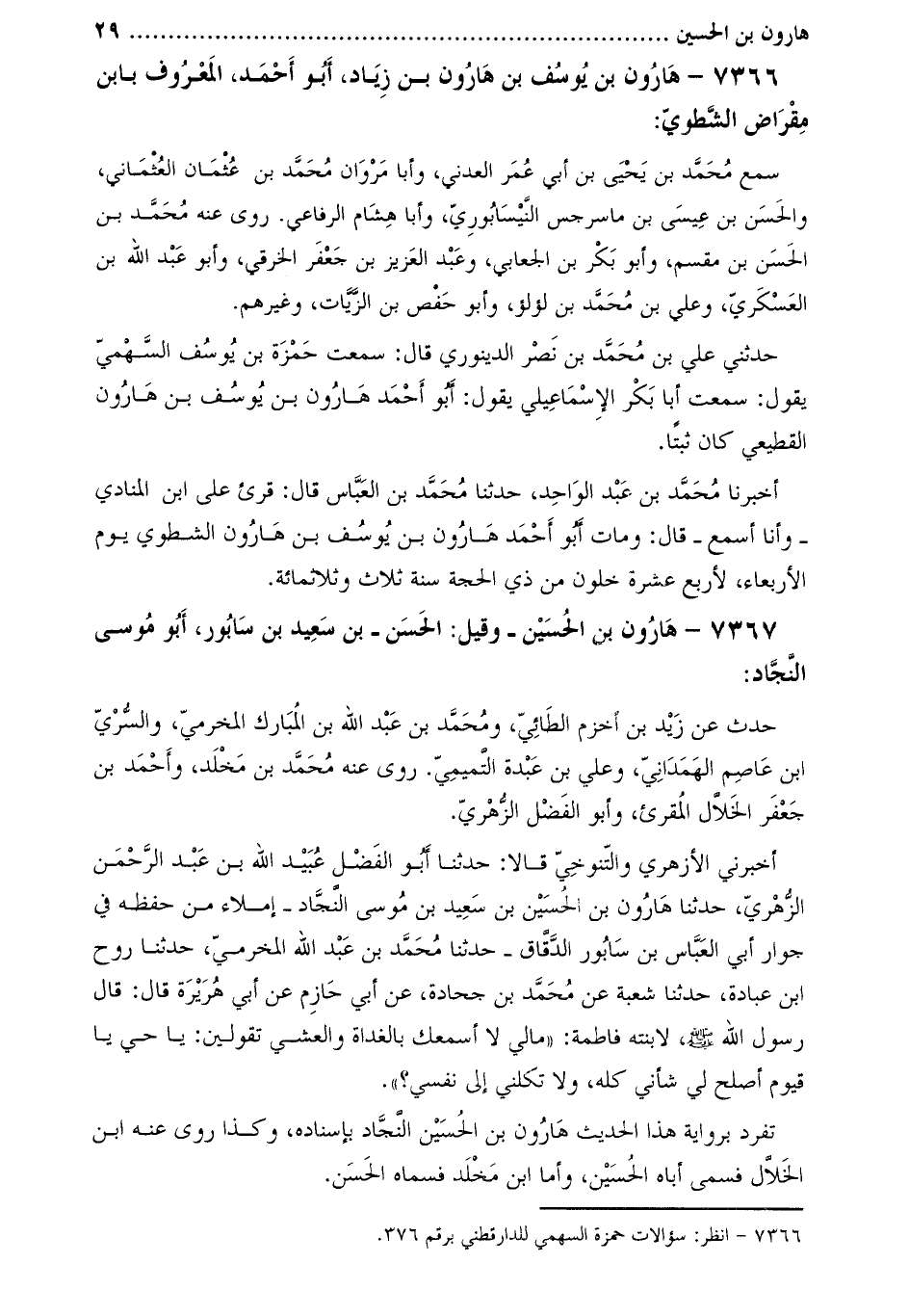 7367- هارون بْن الْحُسَيْن- وقيل: الْحَسَن- بْن سَعِيد بْن سابور، أَبُو مُوسَى النَّجَّاد: