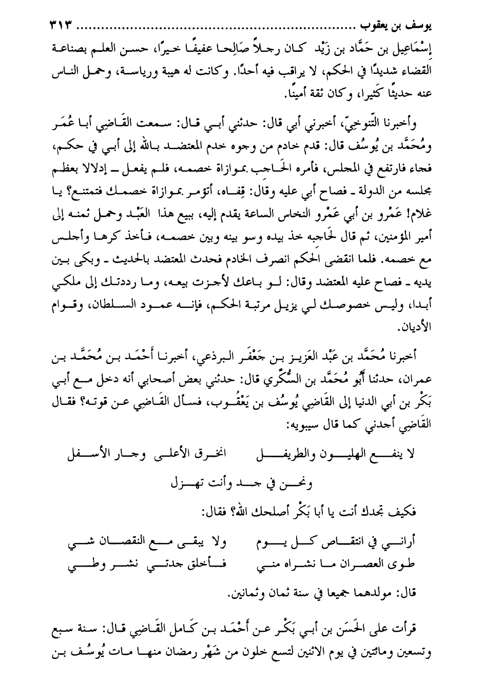 أَخْبَرَنَا مُحَمَّدُ بْنُ عَبْدِ الْعَزِيزِ بْنِ جَعْفَرٍ الْبَرْذَعِيُّ، أخبرنا أحمد بن محمّد بن عمران، حَدَّثَنَا أَبُو مُحَمَّد بْن السكري قَالَ: حدَّثَنِي بعضُ أصحابي أَنَّهُ دخل مَعَ أبي بَكْر بْن أبي الدنيا إلى القاضي يوسف بْن يعقوب، فسأل القاضي عَن قوته؟ فقال القاضي أجدُني كما قَالَ سيبويه: