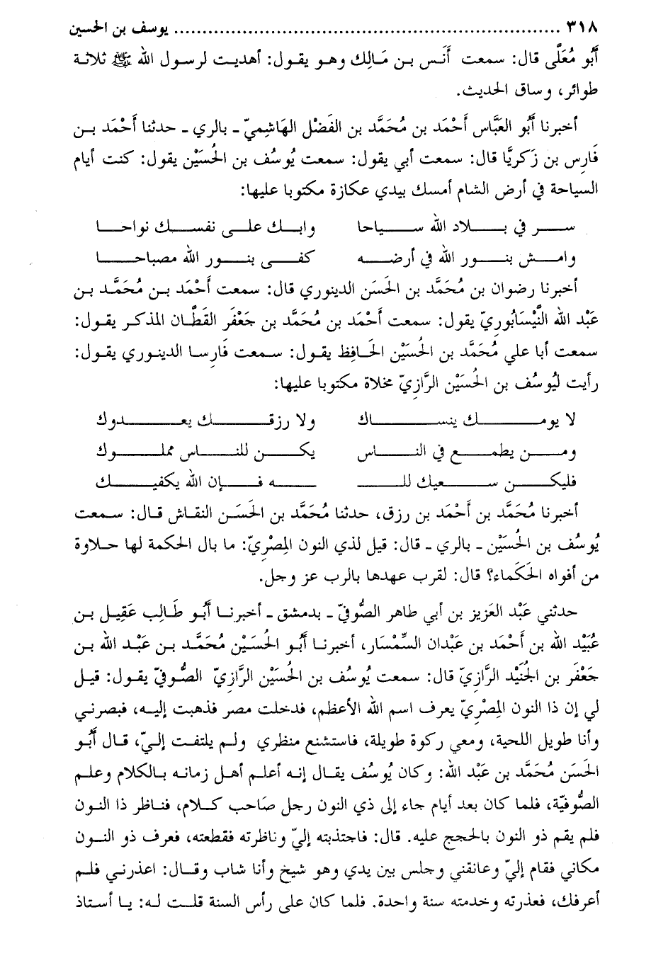 حَدَّثَنِي عَبْد الْعَزِيزِ بْن أَبِي طَاهِر الصوفِي- بدمشق- أَخْبَرَنَا أَبُو طالب عقيل بْن عُبيد الله بن أحمد بن عبدان السّمسار، أخبرنا أَبُو الْحُسَيْن مُحَمَّد بْن عَبْدِ اللَّهِ بْن جَعْفَر بْن الجنيد الرازي قَالَ: سمعتُ يوسف بْن الْحُسَيْن الرازي الصوفي يَقُولُ: قِيلَ لي إنَّ ذا النون الْمِصْرِيّ يعرف اسم الله الأعظم، فدخلتُ مصر فذهبتُ إِلَيْهِ، فبصرني وأنا طويل اللحية، ومعي ركوة طويلة، فاستشنع منظري ولم يلتفت إليّ، قال أبو الحسن مُحَمَّد بْن عَبْد الله: وكان يوسف يُقال إنه أعلم أهل زمانه بالكلام وعلم الصوفية، فلما كَانَ بعد أيام جاء إلى ذي النون رَجُل صاحب كلام، فناظر ذا النون فلم يَقُم ذو النون بالْحُجَج عَلَيْهِ. قَالَ: فاجتذبته إليّ وناظرته فقطعته، فعرَف ذو النون مكاني فقام إليّ وعانقني وجلس بين يدي وهو شيخ وأنا شاب وقال: اعذرني فلم أعرفك، فعذرته وخدمته سنة واحدة. فلما كَانَ عَلَى رأس السنة قلت لَهُ: يا أستاذ