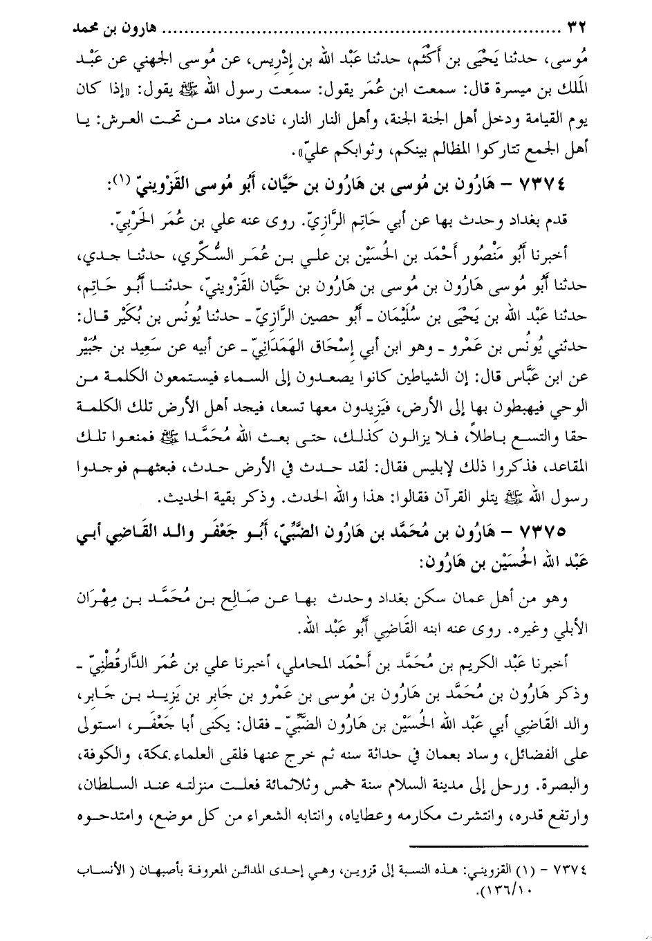 7374- هارون بْن مُوسَى بْن هارون بْن حيَّان، أَبُو مُوسَى القَزْوينيُّ [1] :