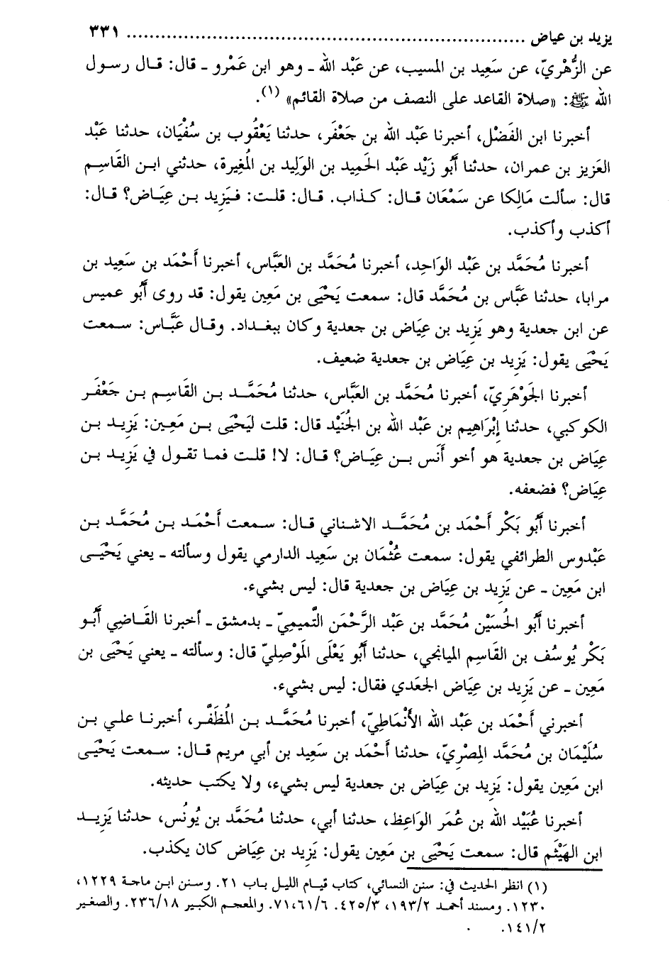 أَخْبَرَنَا ابْن الْفَضْل، أَخْبَرَنَا عَبْدُ اللَّهِ بْنُ جَعْفَرٍ، حَدَّثَنَا يعقوب بن سفيان، حدثنا عبد العزيز بن عمران، حَدَّثَنَا أَبُو زيد عَبْد الحميد بْن الوليد بن المغيرة، حدَّثَنِي ابن القاسم قَالَ: سألتُ مالكًا عَن سمعان قَالَ: كَذَّاب. قَالَ: قلت: فيزيد بْن عياض؟ قَالَ:
