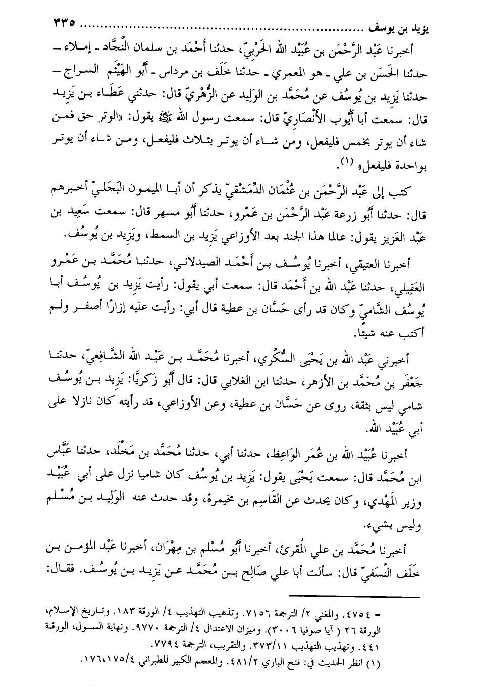 أَخْبَرَنَا عَبْدُ الرَّحْمَنِ بْنُ عُبَيْدِ اللَّهِ الْحَرْبِيُّ، حدثنا أحمد بن سلمان النّجّاد- إملاء- حدثنا الحسن بن علي- هو المعمري- حدثنا خلف بن مرداس- أبو الهيثم السراج- حَدَّثَنَا يَزِيدُ بْنُ يُوسُفَ عَنْ مُحَمَّدِ بْنِ الْوَلِيدِ عَنِ الزُّهْرِيِّ قَالَ: حَدَّثَنِي عَطَاءُ بْنُ يَزِيدَ قَالَ: سَمِعْتُ أَبَا أَيُّوبَ الأَنْصَارِيُّ قَالَ: سَمِعْتُ رَسُولَ اللَّهِ صَلَّى اللَّهُ عَلَيْهِ وسلم يَقُولُ: «الْوِتْرُ حَقٌّ فَمَنْ شَاءَ أَنْ يُوتِرَ بِخَمْسٍ فَلْيَفْعَلْ، وَمَنْ شَاءَ أَنْ يُوتِرَ بِثَلاثٍ فَلْيَفْعَلْ، وَمَنْ شَاءَ أَنْ يُوتِرَ بِوَاحِدَةٍ فَلْيَفْعَلْ» [1] .