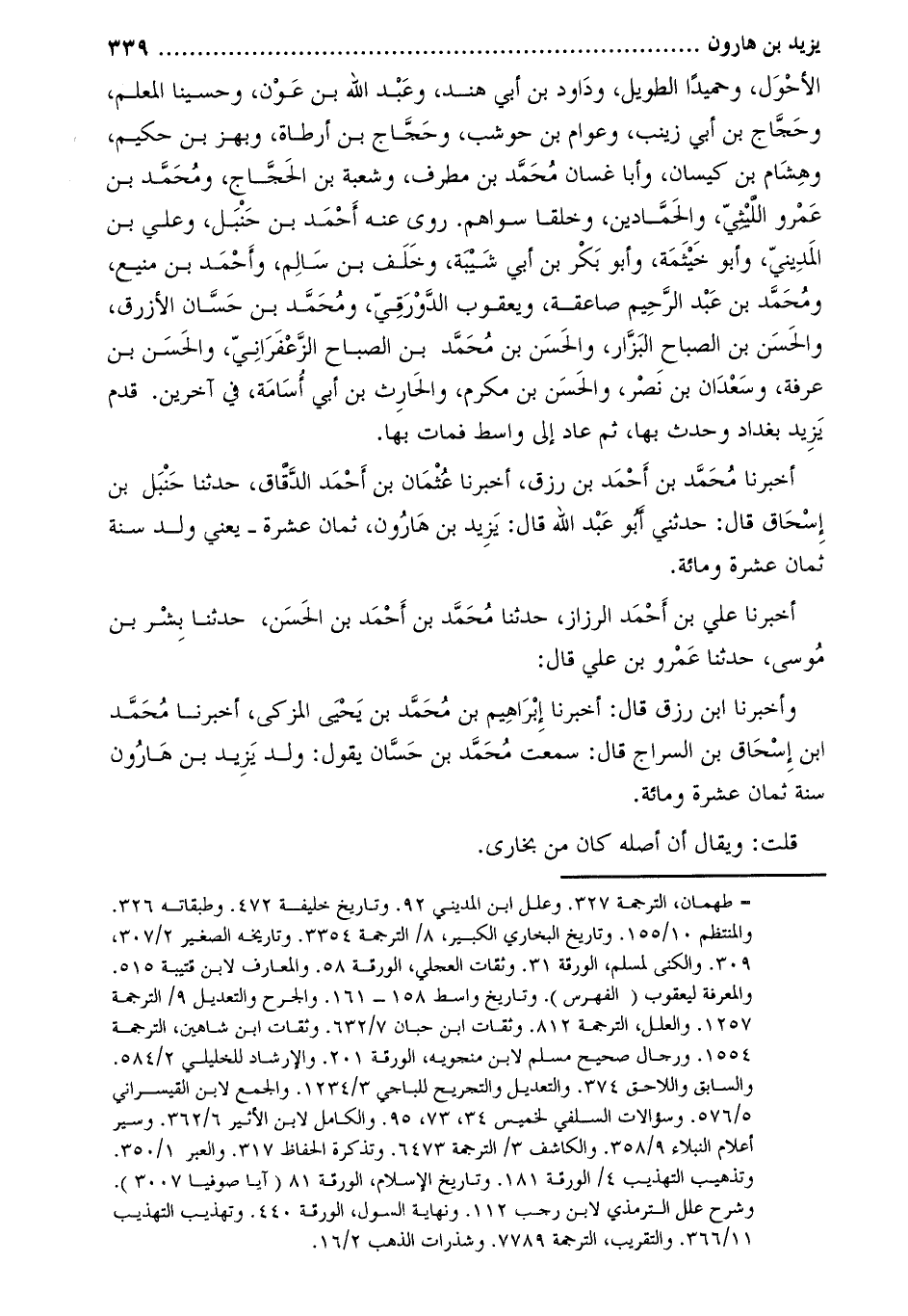 وأَخْبَرَنَا ابن رزق قَالَ: أَخْبَرَنَا إِبْرَاهِيم بْن مُحَمَّد بْن يحيى المزكى، أخبرنا محمّد ابن إسحاق بن السراج قَالَ: سمعتُ مُحَمَّد بْن حسان يَقُولُ: ولد يزيد بْن هارون سنة ثَمان عشرة ومائة.