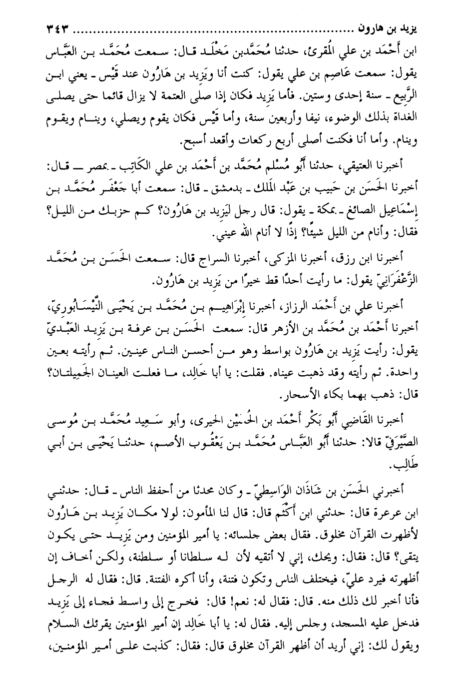 أَخْبَرَنِي الْحَسَن بْن شاذان الواسطي- وكان محدثًا من أحفظ الناس- قَالَ: حدَّثَنِي ابن عرعرة قَالَ: حدَّثَنِي ابن أكثم قَالَ: قَالَ لنا المأمون: لولا مكان يزيد بْن هارون لأظهرتُ القرآن مخلوق. فقال بعض جلسائه: يا أمير المؤمنين ومن يزيد حتى يكون يُتَّقَى؟ قَالَ: فقال: ويحك، إني لا أتقيه لأن لَهُ سلطانًا أو سلطنة، ولكن أخافُ إن أظهرته فيردَّ علي، فيختلف الناس وتكون فتنة، وأنا أكرهُ الفتنة. قَالَ: فقال لَهُ الرجل فأنا أخبرُ لك ذَلِكَ منه. قَالَ: فقال لَهُ: نعم! قال: فخرج إلى واسط فجاء إلى يزيد فدخل عَلَيْهِ المسجد، وجلسَ إِلَيْهِ. فقال لَهُ: يا أَبَا خَالِد إنّ أمير المؤمنين يُقرئك السلام ويقول لك: إني أريد أن أظهرَ القرآن مخلوق قَالَ: فقال: كذبت عَلَى أمير المؤمنين،