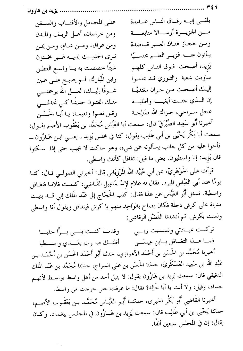 أَخْبَرَنَا مُحَمَّد بْن الحسن بْن أَحْمَد الأهوازي، حدثنا أبو أحمد الْحَسَن بن أَحْمَدَ بْنِ عَبْد اللَّهِ بْن سعيد العسكريّ، حدثنا الحسن بن علي السراج، حدثنا محمد بن عبد الملك الدقيقي قال: سمعتُ يزيد بْن هارون يَقُولُ: لا ينبل أحد من أهل واسط بواسط لأنَّهم حُسَّاد، وقيل: ولا أنت يا أَبَا خَالِد؟ فقال: ما عرفتُ حتى خرجت من واسط.