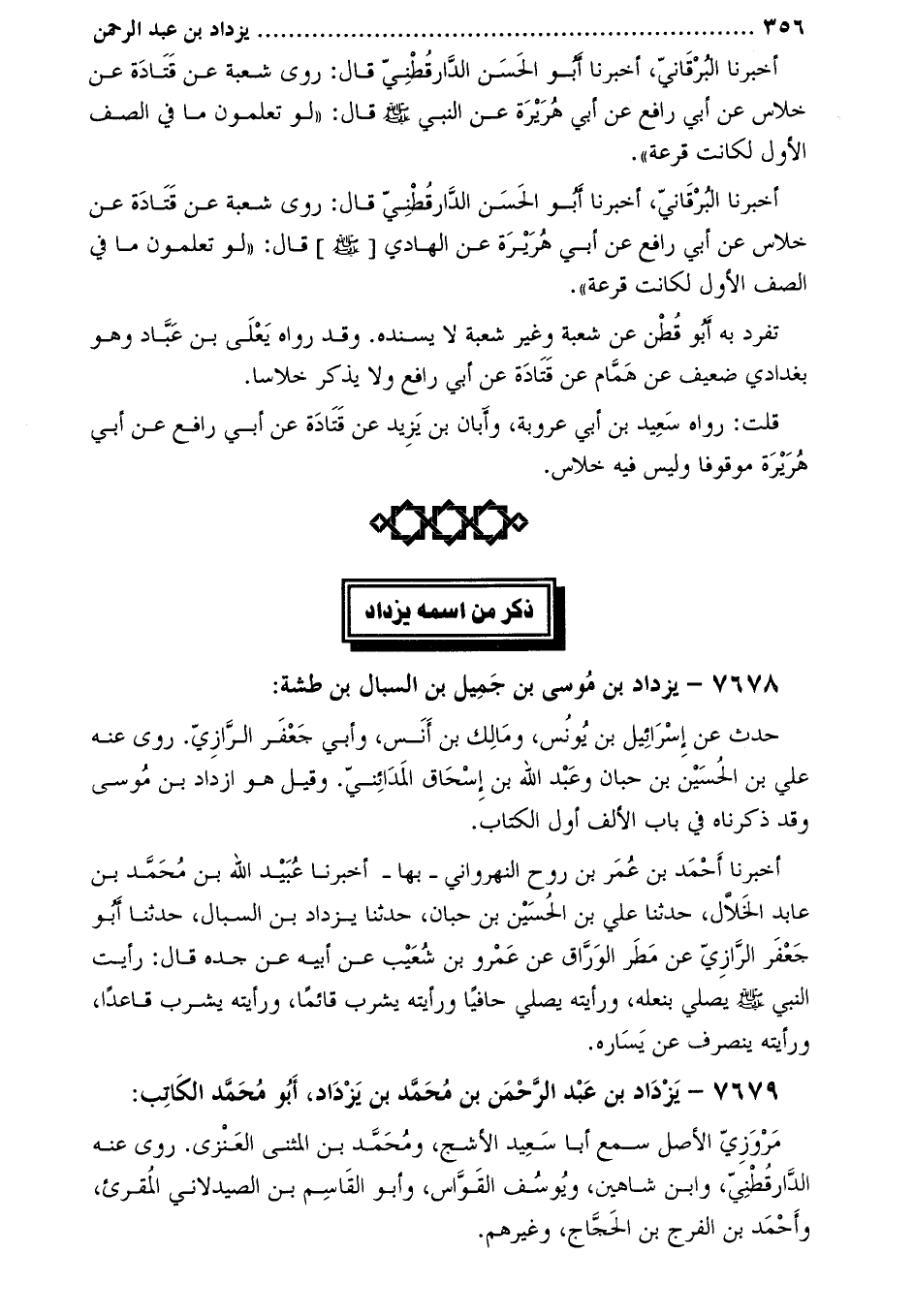 أخبرنا البرقانيّ، أَخْبَرَنَا أَبُو الْحَسَنِ الدَّارَقُطْنِيُّ قَالَ: رَوَى شُعْبَةَ عَنْ قَتَادَةَ عَنْ خِلاسٍ عَنْ أَبِي رَافِعٍ عَنْ أَبِي هُرَيْرَةَ عَنِ الهادي [صَلَّى اللَّهُ عَلَيْهِ وَسَلَّمَ] قَالَ: «لَوْ تَعْلَمُونَ مَا فِي الصَّفِّ الأَوَّلِ لَكَانَتْ قُرْعَةٌ» .