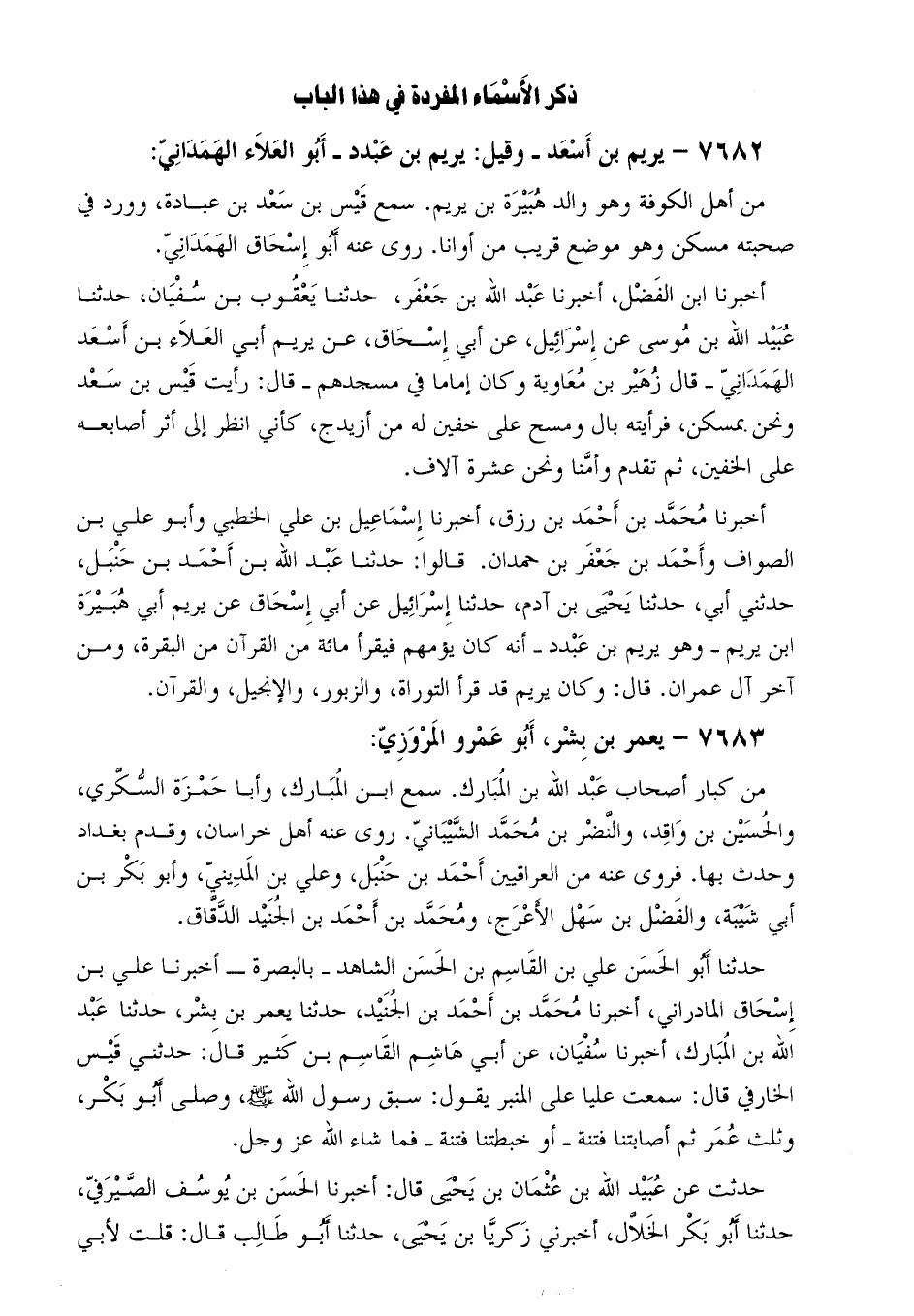 أَخْبَرَنَا مُحَمَّد بْن أَحْمَد بْن رزق، أَخْبَرَنَا إسماعيل بن علي الخطبي وأبو علي بن الصواف وأحمد بْن جَعْفَر بْن حمدان. قالوا: حَدَّثَنَا عَبْد اللَّهِ بْنُ أَحْمَدَ بْنِ حَنْبَلٍ، حَدَّثَنِي أَبِي، حدثنا يحيى بن آدم، حَدَّثَنَا إسرائيل عَن أبي إِسْحَاق عَن يريم أبي هبيرة ابن يَريم- وهو يريم بْن عبدد- أَنَّهُ كَانَ يؤمَّهم فيقرأ مائة من القرآن من البقرة، ومن آخر آل عمران. قَالَ: وكان يريم قد قرأ التوراة، والزبور، والإنجيل، والقرآن.