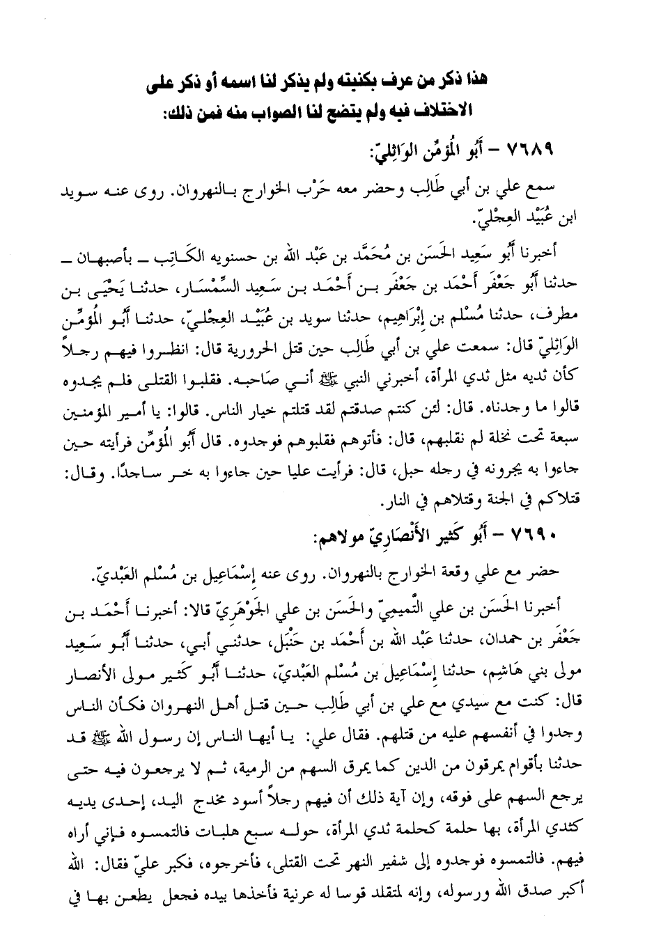 أَخْبَرَنَا الْحَسَنُ بْنُ عَلِيٍّ التَّمِيمِيُّ وَالْحَسَنُ بْنُ عَلِيٍّ الْجَوْهَرِيُّ قَالا: أَخْبَرَنَا أَحْمَدُ بْنُ جَعْفَرِ بْنِ حَمْدَانَ، حدثنا عَبْدُ اللَّهِ بْنُ أَحْمَدَ بْنِ حَنْبَلٍ، حَدَّثَنِي أبي، حدثنا أبو سعيد مولى بني هاشم، حدثنا إسماعيل بن مسلم العبديّ، حَدَّثَنَا أَبُو كَثِيرٍ مَوْلَى الأَنْصَارِ قَالَ: كُنْتُ مَعَ سَيِّدِي مَعَ عَلِيِّ بْنِ أَبِي طَالِبٍ حين قُتِلَ أَهْلُ النَّهْرَوَانِ فَكَأَنَّ النَّاسَ وَجَدُوا فِي أَنْفُسِهِمْ عَلَيْهِ مِنْ قَتْلِهِمْ. فَقَالَ عَلِيٌّ: يَا أَيُّهَا النَّاسُ إِنَّ رَسُولَ اللَّهِ صَلَّى اللَّهُ عَلَيْهِ وَسَلَّمَ قَدْ حَدَّثَنَا بِأَقْوَامٍ يَمْرُقُونَ مِنَ الدِّينِ كَمَا يَمْرُقُ السَّهْمُ مِنَ الرَّمِيَّةِ، ثُمَّ لا يَرْجِعُونَ فِيهِ حَتَّى يَرْجِعَ السَّهْمُ عَلَى فُوقِهِ، وَإِنَّ آيَةَ ذَلِكَ أَنَّ فِيهِمْ رَجُلا أَسْوَدَ مُخْدَجَ الْيَدِ، إِحْدَى يَدَيْهِ كَثَدْيِ الْمَرْأَةِ، بِهَا حَلَمَةٌ كَحَلَمَةِ ثَدْيِ الْمَرْأَةِ، حَوْلَهُ سَبْعُ هَلَبَاتٍ فَالْتَمِسُوهُ فَإِنِّي أَرَاهُ فِيهِمْ. فَالْتَمَسُوهُ فَوَجَدُوهُ إِلَى شَفِيرِ النَّهْرِ تَحْتَ الْقَتْلَى، فَأَخْرَجُوهُ، فَكَبَّرَ عَلِيٌّ فَقَالَ: اللَّهُ أَكْبَرُ صَدَقَ اللَّهُ وَرَسُولُهُ، وإنه لمتقلد قوسا له عرنية فَأَخَذَهَا بِيَدِهِ فَجَعَلَ يَطْعَنُ بِهَا فِي