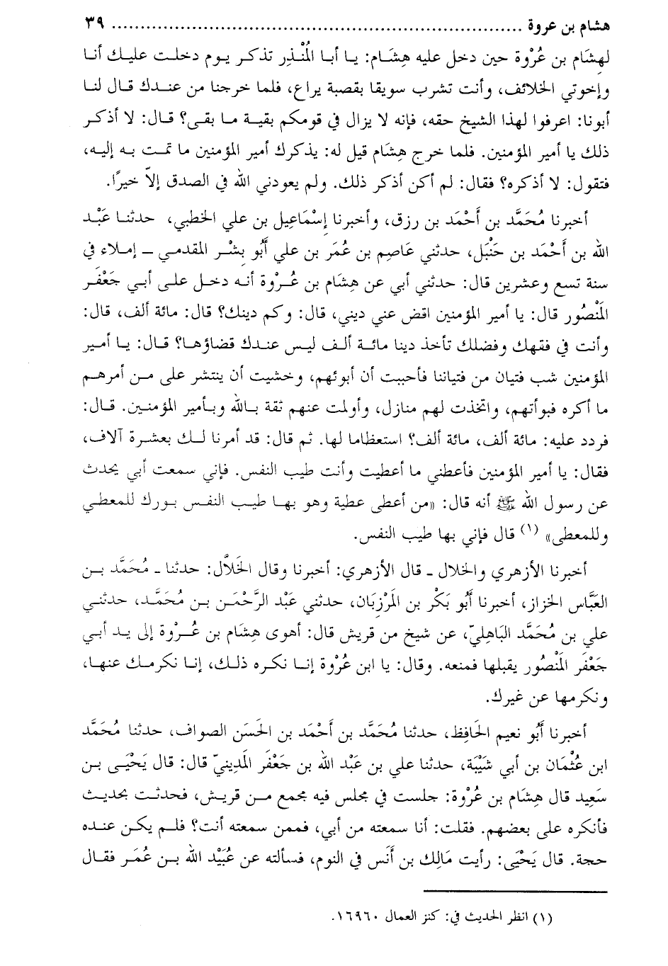 أَخْبَرَنَا الأَزْهَرِيُّ وَالْخَلالُ- قَالَ الأَزْهَرِيُّ: أَخْبَرَنَا وَقَالَ الْخَلالُ: حَدَّثَنَا- مُحَمَّدُ بْنُ الْعَبَّاسِ الْخَزَّازُ، أَخْبَرَنَا أَبُو بكر بن المرزبان، حدثني عبد الرّحمن بن محمّد، حَدَّثَنِي عَلِيُّ بْنُ مُحَمَّدٍ الْبَاهِلِيُّ، عَنْ شَيْخٍ مِنْ قُرَيْشٍ قَالَ: أَهْوَى هِشَامُ بْنُ عُرْوَةَ إِلَى يَدِ أَبِي جَعْفَرٍ الْمَنْصُورِ يُقَبِّلُهَا فَمَنَعَهُ. وقال: يا ابن عروة إنا نكره ذلك، إِنَّا نُكْرِمُكَ عَنْهَا، وَنُكْرِمُهَا عَنْ غَيْرِكَ.
