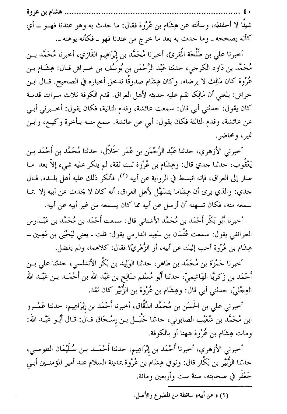 أخبرني الأزهري، حدثنا عَبْد الرَّحْمَن بْن عُمَر الخلال، حَدَّثَنَا مُحَمَّد بن أحمد بن يعقوب، حَدَّثَنَا جدي قَالَ: وهشام بْن عروة ثبتٌ ثقةٌ، لم يُنكر عَلَيْهِ شيء إلا بعد ما صارَ إلى العراق، فإنه انبَسط فِي الرواية عن أبيه [1] ، فأنكرَ ذَلِكَ عَلَيْهِ أهلُ بلده. قَالَ جدي: والذي يرى أن هشامًا يَتسهَّل لأهل العراق، أَنَّهُ كَانَ لا يحدث عَن أَبِيهِ إلا بِما سمعه منه، فكان تسهله أن أرسَلَ عَن أَبِيهِ مما كَانَ يسمعه من غير أَبِيهِ عَنْ أَبِيهِ.