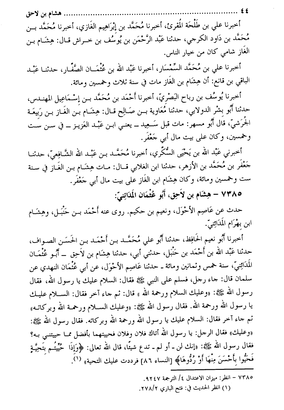 أخبرنا أبو نعيم الحافظ، حَدَّثَنَا أَبُو عَلِيٍّ مُحَمَّدُ بْنُ أَحْمَدَ بْنِ الْحَسَنِ الصواف، حدثنا عَبْدُ اللَّهِ بْنُ أَحْمَدَ بْنِ حَنْبَلٍ، حَدَّثَنِي أبي، حَدَّثَنَا هِشَامُ بْنُ لاحِقٍ- أَبُو عُثْمَانَ الْمَدَائِنِيُّ، سنة خمس وثمانين ومائة- حَدَّثَنَا عَاصِمٍ الأَحْوَلِ، عَنْ أَبِي عُثْمَانَ النَّهْدِيِّ عَنْ سَلْمَانَ قَالَ: جَاءَ رَجُلٌ، فَسَلَّمَ عَلَى النَّبِيِّ صَلَّى اللَّهُ عَلَيْهِ وَسَلَّمَ فَقَالَ: السَّلامُ عَلَيْكَ يَا رَسُولَ اللَّهِ، فقَالَ رَسُولُ اللَّهِ صَلَّى اللَّهُ عَلَيْهِ وَسَلَّمَ: «وَعَلَيْكَ السَّلامُ وَرَحْمَةُ اللَّهِ» قَالَ: ثُمَّ جَاءَ آخَرُ فَقَالَ: السَّلامُ عَلَيْكَ يَا رَسُولَ اللَّهِ وَرَحْمَةُ اللَّهِ. فقَالَ رَسُولُ اللَّهِ صَلَّى اللَّهُ عَلَيْهِ وَسَلَّمَ: «وَعَلَيْكَ السَّلامُ وَرَحْمَةُ اللَّهِ وَبَرَكَاتُهُ» ثُمَّ جَاءَ آخَرُ فَقَالَ: السَّلامُ عَلَيْكَ يَا رَسُولَ اللَّهِ وَرَحْمَةُ اللَّهِ وَبَرَكَاتُهُ. فَقَالَ رَسُولُ اللَّهِ صَلَّى اللَّهُ عَلَيْهِ وَسَلَّمَ: