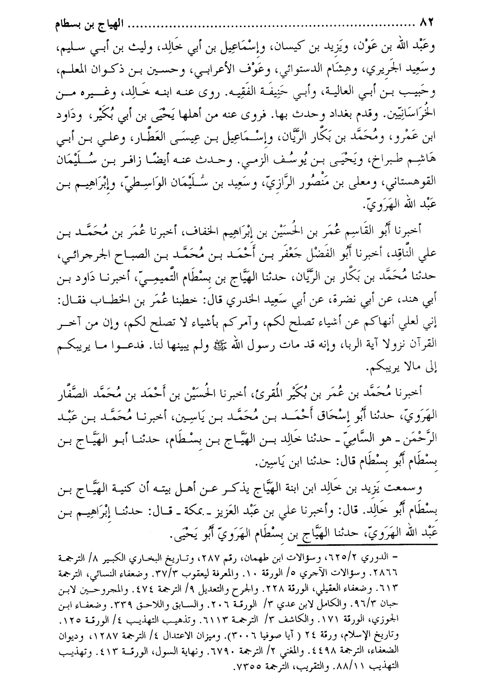 وسمعتُ يزيد بْن خَالِد ابْن ابْنَة الهَيَّاج يذكرُ عَن أهل بيته أن كنية الهياج بن بسطام أَبُو خَالِد. قَالَ: وَأَخْبَرَنَا عَلِيّ بْن عَبْد العزيز- بِمكة- قَالَ: حَدَّثَنَا إِبْرَاهِيمُ بْنُ عَبْدِ اللَّهِ الْهَرَوِيُّ، حَدَّثَنَا الهَيَّاج بْن بسطام الْهَرَويّ أَبُو يَحْيَى.