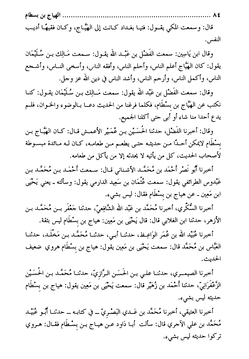 أَخْبَرَنَا عبيد الله بن عمر الواعظ، حدثنا أبي، حدثنا محمّد بن مخلد، حَدَّثَنَا الْعَبَّاس بْن مُحَمَّد قَالَ: سمعتُ يَحْيَى بْن معين يَقُولُ: هَيَّاج بْن بسطام هروي ضعيف الحديث.