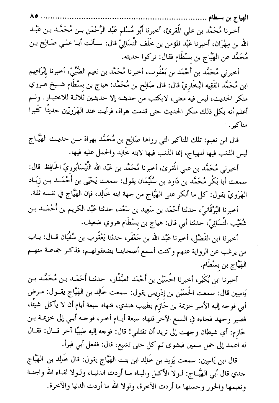 أخبرني محمّد بن أحمد بن يعقوب، أخبرنا محمّد بن نعيم الضّبّيّ، أخبرنا إبراهيم ابن مُحَمَّد الفقيه الْبُخَاريّ قَالَ: قَالَ صالِح بْن مُحَمَّد: هَيَّاج بْن بسطام شيخٌ هروي منكر الحديث، لَيْسَ فِيهِ معنى، لا يُكتب من حديثه إلا حديثين ثلاثة للاختبار. ولَمْ أعلم أَنَّهُ بكل ذَلِكَ منكر الحديث حتى قدمت هراة، فرأيتُ عِنْدَ الهرويين حديثًا كثيرًا مناكير.