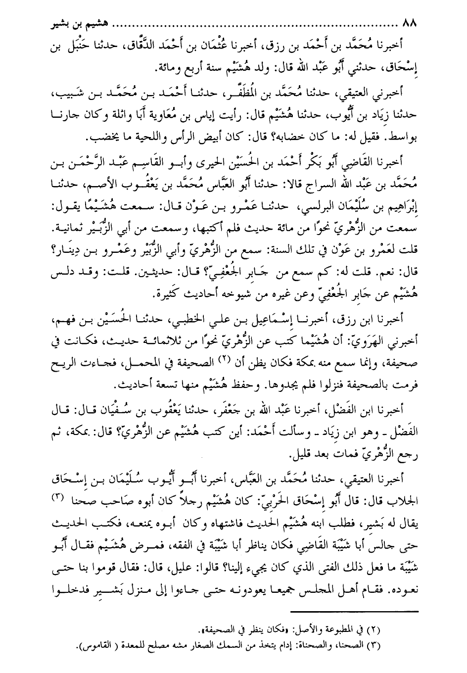 أخبرنا العتيقي، حَدَّثَنَا مُحَمَّد بْن الْعَبَّاس، أَخْبَرَنَا أَبُو أَيُّوب سُلَيْمَانُ بْنُ إِسْحَاقَ الْجَلابُ قَالَ: قَالَ أَبُو إِسْحَاق الحربي: كَانَ هشيم رجلا كان أبوه صاحب صحنا [2] يقال له بشير، فطلب ابنه هشيم الحديث فاشتهاه وكان أبوه يمنعه، فكتب الحديث حتى جالس أبا شيبة القاضي فكان يناظر أبا شيبة في الفقه، فمرض هشيم فقال أبو شيبة ما فعل ذلك الفتى الذي كان يجيء إلينا؟ قَالُوا: عليلٌ، قَالَ: فقال قوموا بنا حتى نعوده. فقام أهل المجلس جميعًا يعودونه حتى جاءوا إلى منزل بشير فدخلوا