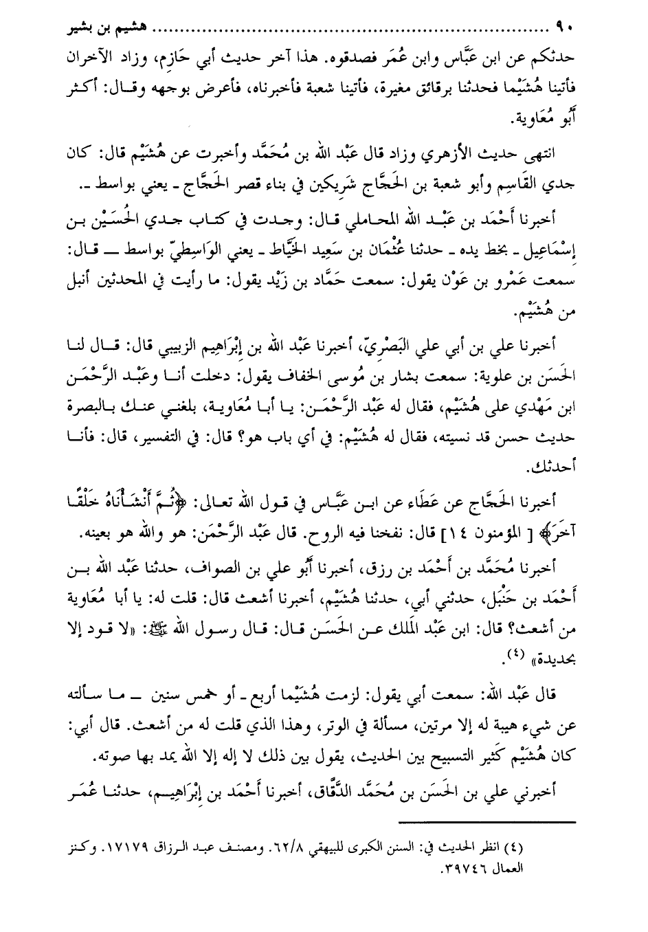 أَخْبَرَنَا عَلِيّ بْن أبي علي البصريّ، أَخْبَرَنَا عَبْدُ اللَّهِ بْنُ إِبْرَاهِيمَ الزَّبِيبِيُّ قَالَ: قَالَ لنا الْحَسَن بْن علويه: سمعتُ بشار بْن مُوسَى الخفاف يَقُولُ: دخلتُ أَنَا وعبد الرّحمن ابن مهدي عَلَى هشيم، فقال لَهُ عَبْد الرَّحْمَن: يا أَبَا مُعَاويَة، بَلَغني عنك بالبصرة حديث حسن قد نسيته، فقال لَهُ هشيم: فِي أي باب هُوَ؟ قَالَ: فِي التفسير، قَالَ: فأنا أُحدثك.
