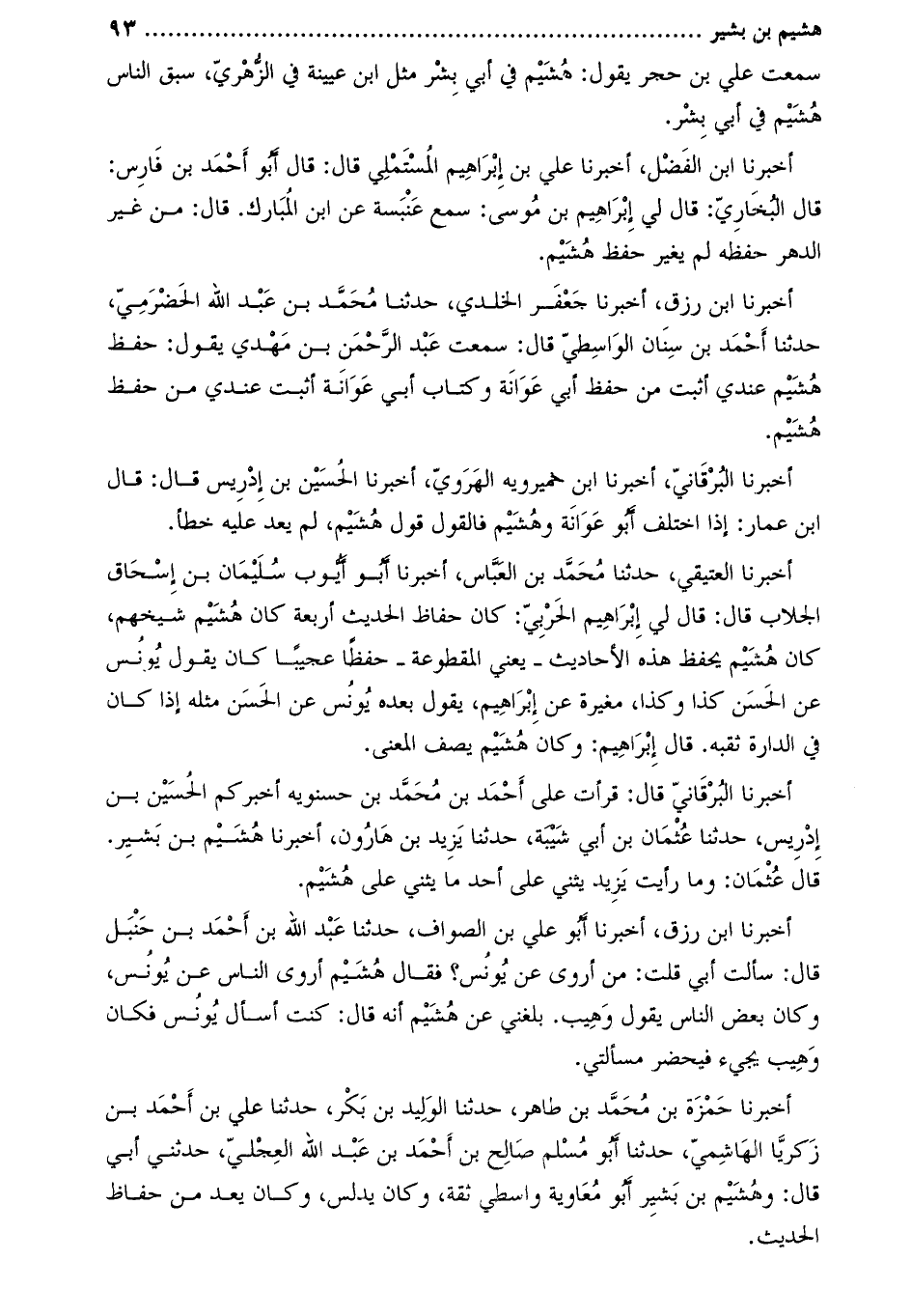 أَخْبَرَنَا حمزة بْن مُحَمَّد بْن طاهر، حدثنا الوليد بن بكر، حدثنا علي بن أحمد بن زكريا الهاشمي، حدثنا أبو مسلم صالح بن أحمد بن عبد الله العجليّ، حدَّثَنِي أبي قَالَ: وهُشيم بْن بشير أَبُو مُعَاويَة واسطي ثقة، وكان يُدلس، وكان يُعد من حفاظ الحديث.