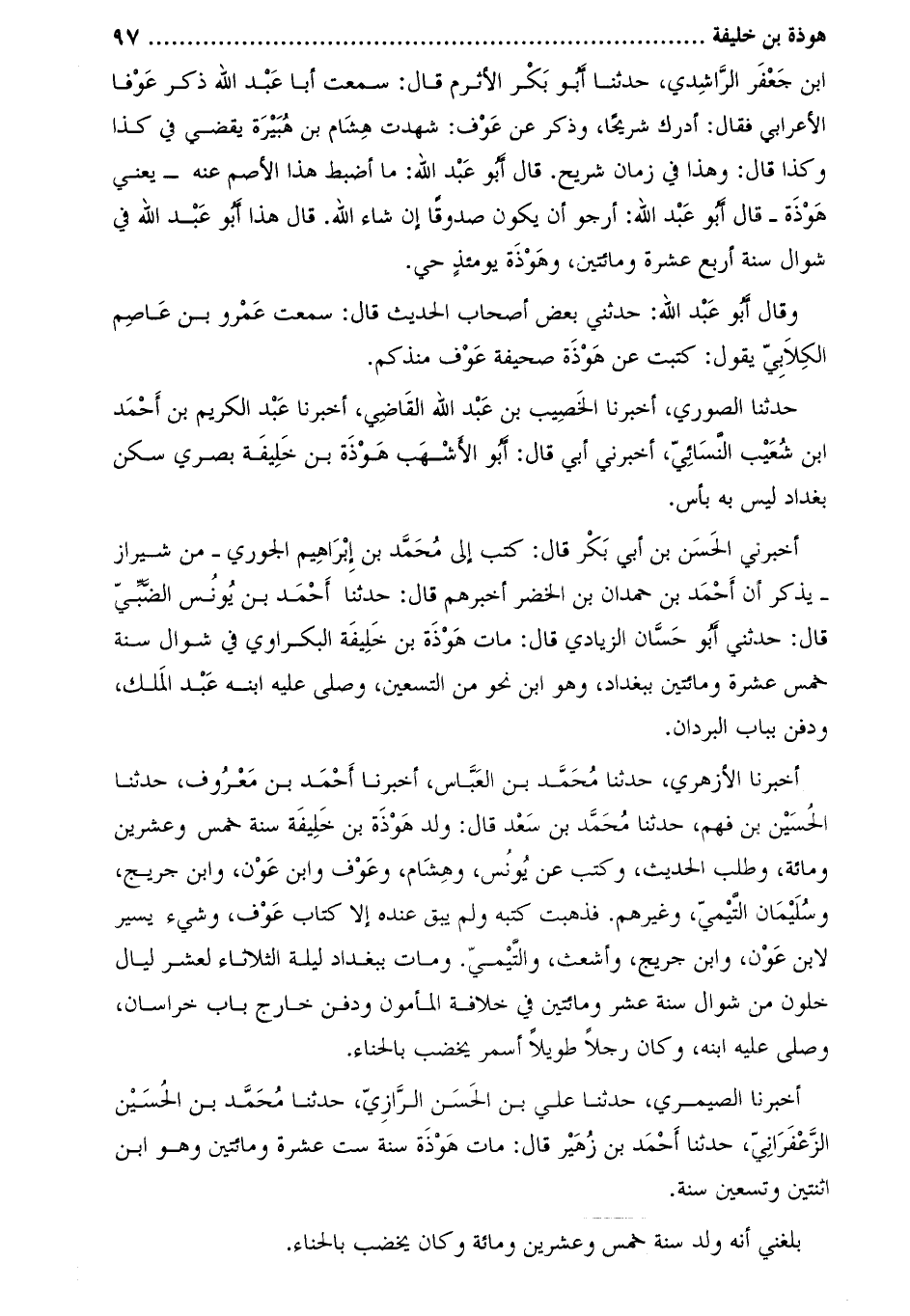أخبرنا الأزهري، حَدَّثَنَا مُحَمَّد بْن الْعَبَّاس، أخبرنا أَحْمَد بْن معروف، حَدَّثَنَا الْحُسَيْن بْن فهم، حَدَّثَنَا مُحَمَّد بْن سعد قَالَ: وُلِدَ هوذة بْن خليفة سنة خمس وعشرين ومائة، وطلب الحديث، وكتب عَن يونس، وهشام، وعوف وابن عون، وابن جريج، وسليمان التيمي، وغيرهم. فذهبت كتبه ولم يبق عنده إلا كتاب عوف، وشيء يسير لابن عون، وابن جريج، وأشعث، والتيمي. ومات ببغداد ليلة الثلاثاء لعشر ليال خلون من شوال سنة عشر ومائتين في خلافة المأمون ودفن خارج باب خراسان، وصلى عليه ابنه، وكان رجلا طويلا أسمر يخضب بالحناء.