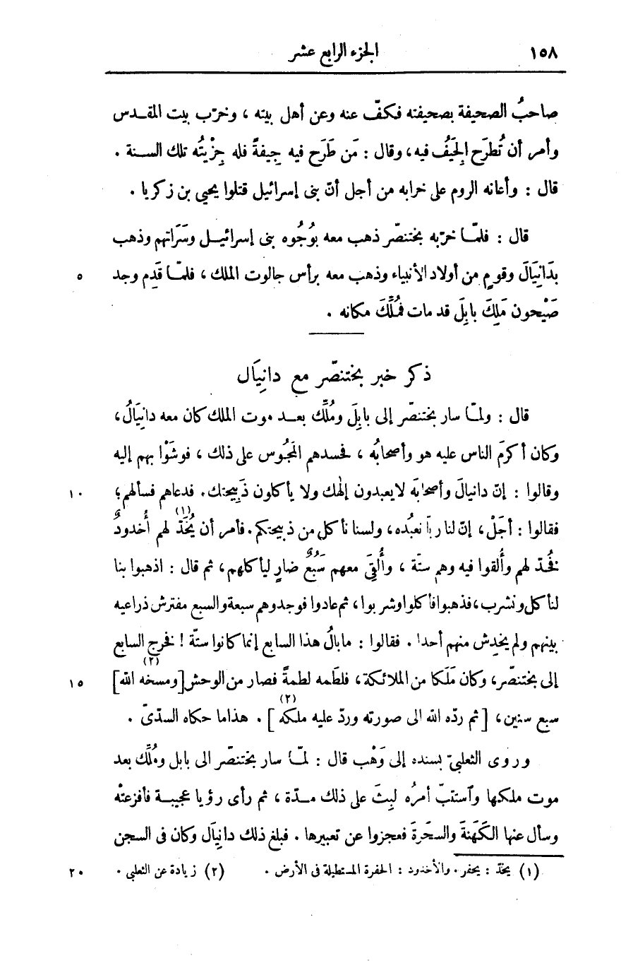 وروى الثعلبىّ بسنده إلى وهب قال: لمّا سار بختنصّر الى بابل وملّك بعد موت ملكها واستتبّ أمره لبث على ذلك مدّة، ثم رأى رؤيا عجيبة فأفزعته وسأل عنها الكهنة والسحرة فعجزوا عن تعبيرها. فبلغ ذلك دانيال وكان فى السجن