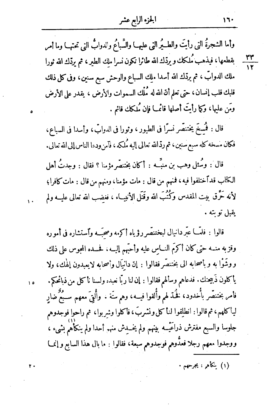 قال: وسئل وهب بن منبّه: أكان بختنصّر مؤمنا؟ فقال: وجدت أهل الكتاب قد اختلفوا فيه، فمنهم من قال: مات مؤمنا، ومنهم من قال: مات كافرا؛ لأنه حرّق بيت المقدس وكتب الله وقتل الأنبياء، فغضب الله تعالى عليه ولم يقبل توبته.