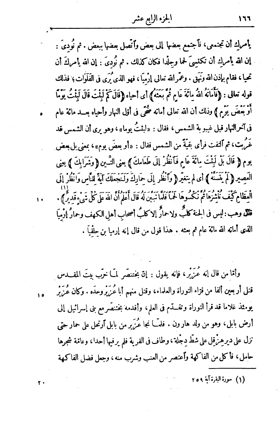 وأمّا من قال إنه عزير، فإنه يقول: إنّ بختنصّر لمّا خرّب بيت المقدس قتل أربعين ألفا من قرّاء التوراة والعلماء، وقتل منهم أبا عزير وحده. وكان عزير يومئذ غلاما قد قرأ التوراة وتقدّم فى العلم، وأقدمه بختنصّر مع بنى إسرائيل إلى أرض بابل، وهو من ولد هارون. فلمّا نجا عزير من بابل ارتحل على حمار حتى نزل على دير هزقل على شطّ دجلة، وطاف فى القرية فلم يرفيها أحدا، وعامّة شجرها حامل، فأكل من الفاكهة واعتصر من العنب وشرب منه، وجعل فضل الفاكهة