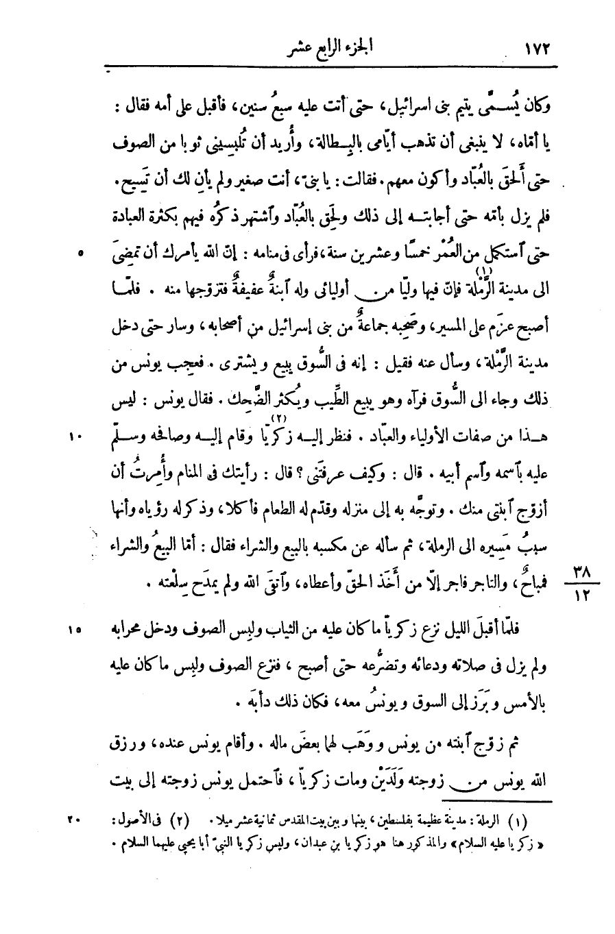 فلم يزل بأمّه حتى أجابته إلى ذلك ولحق بالعبّاد واشتهر ذكره فيهم بكثرة العبادة حتى استكمل من العمر خمسا وعشرين سنة، فرأى فى منامه: إنّ الله يأمرك أن تمضى الى مدينة الرّملة «1» فإنّ فيها وليّا من أوليائى وله ابنة عفيفة فتزوّجها منه. فلمّا أصبح عزم على المسير، وصحبه جماعة من بنى إسرائيل من أصحابه، وسار حتى دخل مدينة الرّملة، وسأل عنه فقيل: إنه فى السّوق يبيع ويشترى. فعجب يونس من ذلك وجاء الى السّوق فرآه وهو يبيع الطّيب ويكثر الضّحك. فقال يونس: ليس هذا من صفات الأولياء والعبّاد. فنظر إليه زكريّا «2» وقام إليه وصافحه وسلّم عليه باسمه واسم أبيه. قال: وكيف عرفتنى؟ قال: رأيتك فى المنام وأمرت أن أزوّج ابنتى منك. وتوجّه به إلى منزله وقدّم له الطعام فأكلا، وذكر له رؤياه وأنها سبب مسيره الى الرملة، ثم سأله عن مكسبه بالبيع والشراء فقال: أمّا البيع والشراء فمباح، والتاجر فاجر إلّا من أخذ الحقّ وأعطاه، واتقى الله ولم يمدح سلعته.
