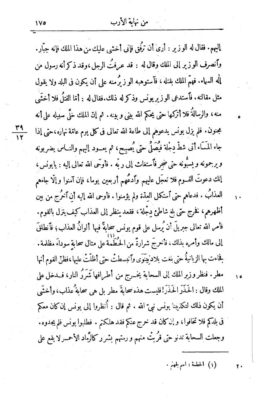 وانصرف الوزير إلى الملك وقال له: قد عرفت الرجل، وقد ذكر أنه رسول من إله السماء. فهمّ الملك بقتله، فآستوهبه الوزير منه على أن يكون فى البلد ولا يقول مثل مقالته. فاستدعى الوزير يونس وذكر له ذلك. فقال له: أمّا القتل فلا أخشى منه، والرسالة فلا أتركها حتى يحكم الله بينى وبينه. ثم إنّ الملك خلّى سبيله على أنه مجنون. فلم يزل يونس يدعوهم إلى طاعة الله تعالى فى كل يوم عامّة نهاره، حتى إذا جاء المساء أتى شطّ دجلة فيصلّى حتى يصبح، ثم يعود إليهم والناس يضربونه ويرجمونه ويسبّونه حتى ضجر فاستغاث إلى ربّه. فأوحى الله تعالى إليه: يا يونس، إنك دعوت القوم فلا تعجل عليهم وادعهم أربعين يوما، فإن آمنوا وإلّا جاءهم العذاب. فدعاهم حتى استكمل العدّة ولم يؤمنوا. فأوحى الله إليه أن اخرج من بين أظهرهم، فخرج حتى بلغ شاطئ دجلة، فقعد ينظر إلى العذاب كيف ينزل بالقوم.