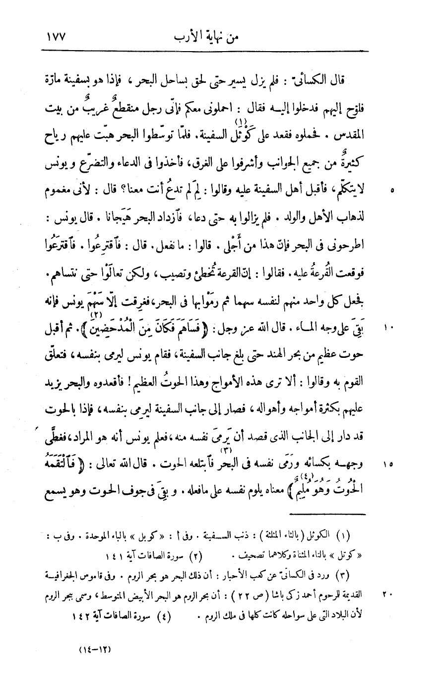 قال الكسائىّ: فلم يزل يسير حتى لحق بساحل البحر، فإذا هو بسفينة مارّة فلوّح إليهم فدخلوا إليه فقال: احملونى معكم فإنّى رجل منقطع غريب من بيت المقدس. فحملوه فقعد على كوثل «1» السفينة. فلمّا توسّطوا البحر هبّت عليهم رياح كثيرة من جميع الجوانب وأشرفوا على الغرق، فأخذوا فى الدعاء والتضرّع ويونس لا يتكلّم، فأقبل أهل السفينة عليه وقالوا: لم لم تدع أنت معنا؟ قال: لأنى مغموم لذهاب الأهل والولد. فلم يزالوا به حتى دعا، فازداد البحر هيجانا. قال يونس: