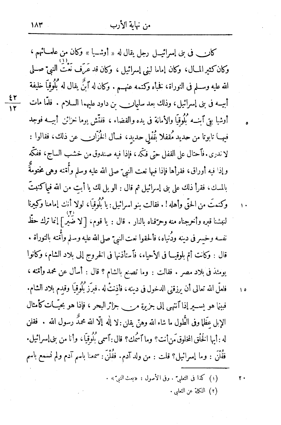 كان فى بنى إسرائيل رجل يقال له «أوشيا» وكان من علمائهم، وكان كثير المال، وكان إماما لبنى إسرائيل، وكان قد عرف نعت «1» النبىّ صلى الله عليه وسلم فى التوراة، فخبأه وكتمه عنهم. وكان له ابن يقال له بلوقيا خليفة أبيه فى بنى إسرائيل، وذلك بعد سليمان بن داود عليهما السلام. فلمّا مات أوشيا بقى ابنه بلوقيا والأمانة فى يده والقضاء، ففتّش يوما خزائن أبيه فوجد فيها تابوتا من حديد مقفلا بقفل حديد، فسأل الخزّان عن ذلك، فقالوا: