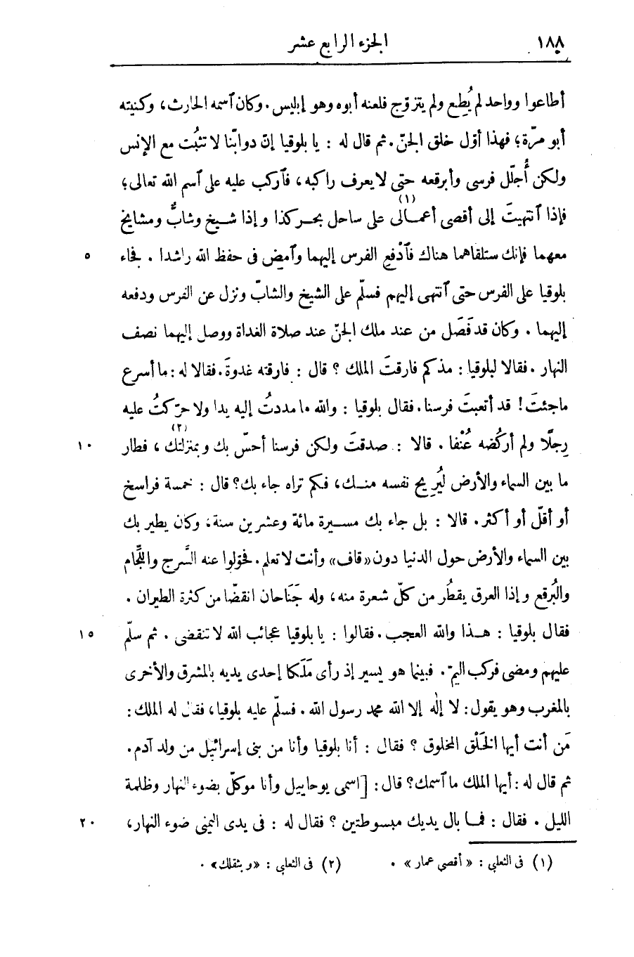 أطاعوا وواحد لم يطع ولم يتزوّج فلعنه أبوه وهو إبليس. وكان اسمه الحارث، وكنيته أبو مرّة؛ فهذا أوّل خلق الجنّ. ثم قال له: يا بلوقيا إنّ دوابّنا لا تثبت مع الإنس ولكن أجلّل فرسى وأبرقعه حتى لا يعرف راكبه، فاركب عليه على اسم الله تعالى؛ فإذا انتهيت إلى أقصى أعمالى «1» على ساحل بحر كذا وإذا شيخ وشابّ ومشايخ معهما فإنك ستلقاهما هناك فادفع الفرس إليهما وامض فى حفظ الله راشدا. فجاء بلوقيا على الفرس حتى انتهى إليهم فسلم على الشيخ والشابّ ونزل عن الفرس ودفعه إليهما. وكان قد فصل من عند ملك الجنّ عند صلاة الغداة ووصل إليهما نصف النهار. فقالا لبلوقيا: مذكم فارقت الملك؟ قال: فارقته غدوة. فقالا له: ما أسرع ما جئت! قد أتعبت فرسنا. فقال بلوقيا: والله ما مددت إليه يدا ولا حرّكت عليه رجلا ولم أركضه عنفا. قالا: صدقت ولكن فرسنا أحسّ بك وبمنزلتك «2» ، فطار ما بين السماء والأرض ليريح نفسه منك، فكم تراه جاء بك؟ قال: خمسة فراسخ أو أقلّ أو أكثر. قالا: بل جاء بك مسيرة مائة وعشرين سنة، وكان يطير بك بين السماء والأرض حول الدنيا دون «قاف» وأنت لا تعلم. فحوّلوا عنه السّرج واللّجام والبرقع وإذا العرق يقطر من كلّ شعرة منه، وله جناحان انقضّا من كثرة الطيران.