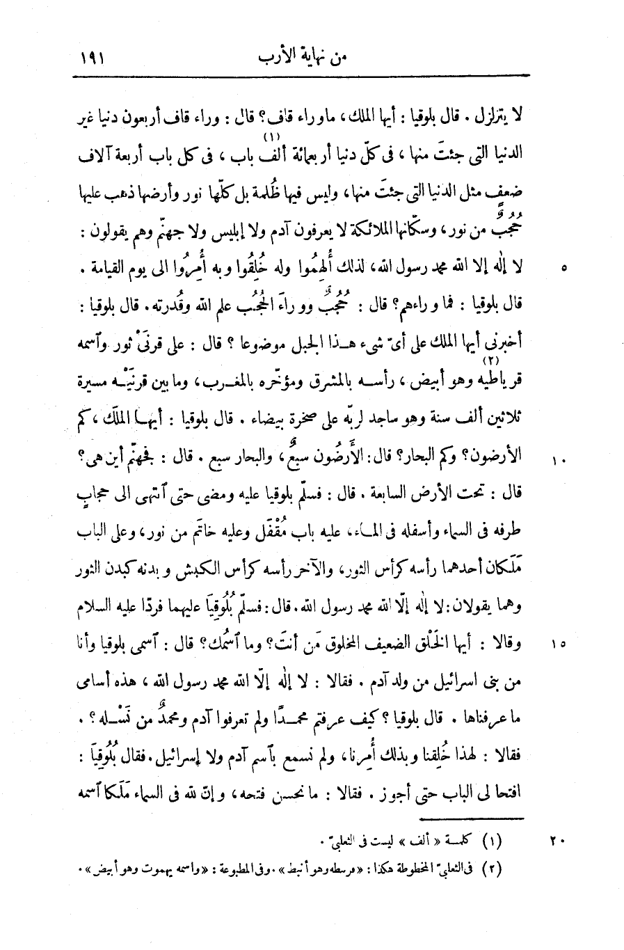 قال: تحت الأرض السابعة. قال: فسلم بلوقيا عليه ومضى حتى انتهى الى حجاب طرفه فى السماء وأسفله فى الماء، عليه باب مقفل وعليه خاتم من نور، وعلى الباب ملكان أحدهما رأسه كرأس الثور، والآخر رأسه كرأس الكبش وبدنه كبدن الثور وهما يقولان: لا إله إلّا الله محمد رسول الله. قال: فسلم بلوقيا عليهما فردّا عليه السلام وقالا: أيها الخلق الضعيف المخلوق من أنت؟ وما اسمك؟ قال: اسمى بلوقيا وأنا من بنى إسرائيل من ولد آدم. فقالا: لا إله إلّا الله محمد رسول الله، هذه أسامى ما عرفناها. قال بلوقيا؟ كيف عرفتم محمدا ولم تعرفوا آدم ومحمد من نسله؟.