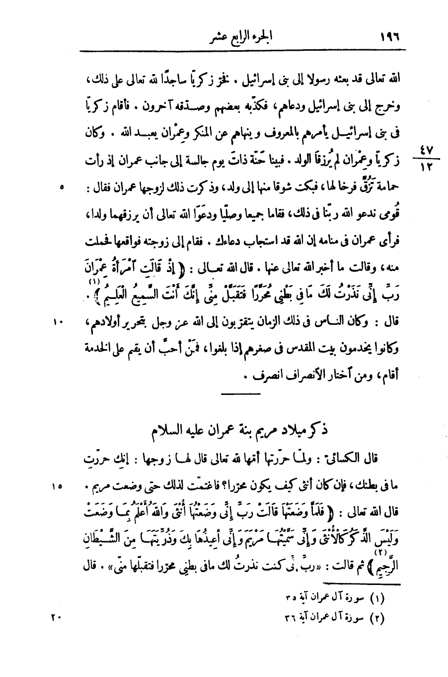 قومى ندعو الله ربّنا فى ذلك، فقاما جميعا وصلّيا ودعوا الله تعالى أن يرزقهما ولدا، فرأى عمران فى منامه إن الله قد استجاب دعاءك. فقام إلى زوجته فواقعها فحملت منه، وقالت ما أخبر الله تعالى عنها. قال الله تعالى: إِذْ قالَتِ امْرَأَتُ عِمْرانَ رَبِّ إِنِّي نَذَرْتُ لَكَ ما فِي بَطْنِي مُحَرَّراً فَتَقَبَّلْ مِنِّي إِنَّكَ أَنْتَ السَّمِيعُ الْعَلِيمُ «1» .