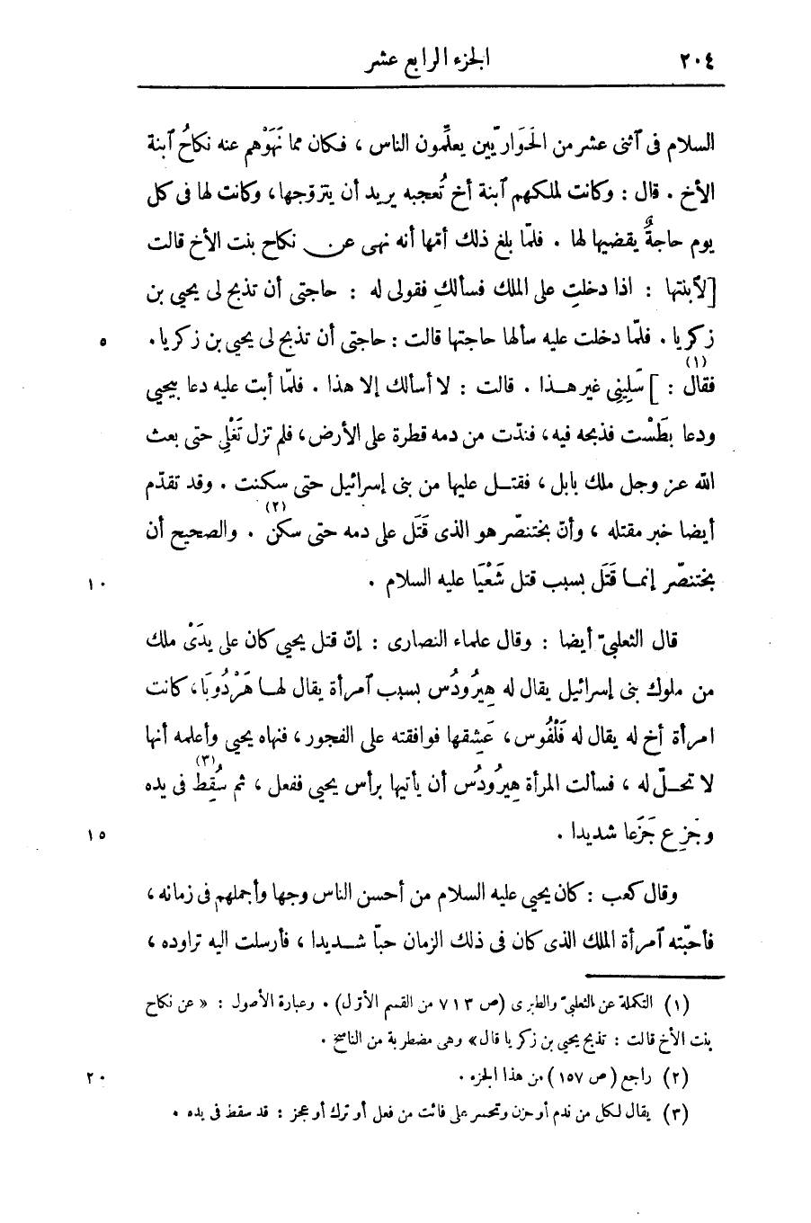 السلام فى اثنى عشر من الحواريّين يعلّمون الناس، فكان مما نهوهم عنه نكاح ابنة الأخ. قال: وكانت لملكهم ابنة أخ تعجبه يريد أن يتزوّجها، وكانت لها فى كل يوم حاجة يقضيها لها. فلمّا بلغ ذلك أمّها أنه نهى عن نكاح بنت الأخ قالت [لابنتها: اذا دخلت على الملك فسألك فقولى له: حاجتى أن تذبح لى يحيى بن زكريا. فلمّا دخلت عليه سألها حاجتها قالت: حاجتى أن تذبح لى يحيى بن زكريا.