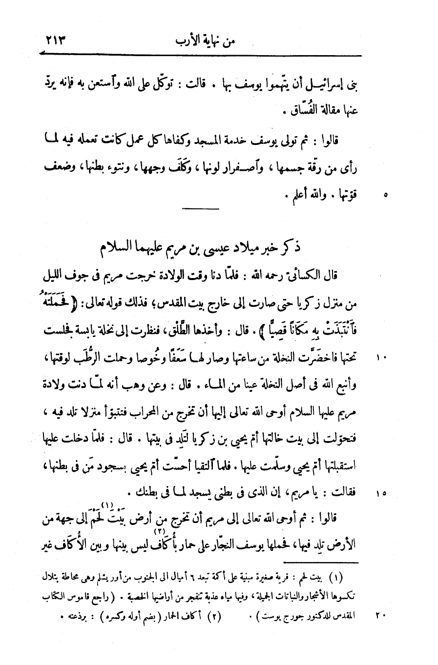 قال الكسائىّ رحمه الله: فلمّا دنا وقت الولادة خرجت مريم فى جوف الليل من منزل زكريا حتى صارت إلى خارج بيت المقدس؛ فذلك قوله تعالى: فَحَمَلَتْهُ فَانْتَبَذَتْ بِهِ مَكاناً قَصِيًّا