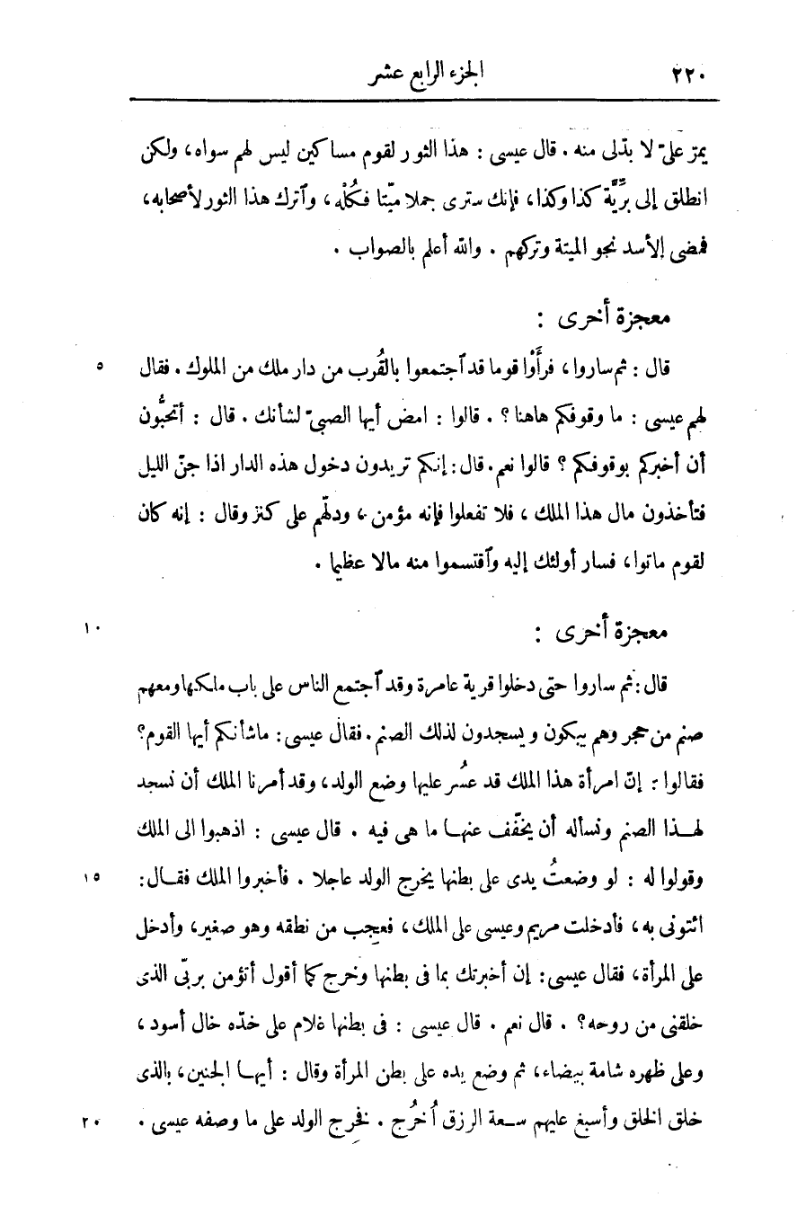 يمرّ علىّ لا بدّ لى منه. قال عيسى: هذا الثور لقوم مساكين ليس لهم سواه، ولكن انطلق إلى برّيّة كذا وكذا، فإنك سترى جملا ميّتا فكله، واترك هذا الثور لأصحابه، فمضى الأسد نجو الميتة وتركهم. والله أعلم بالصواب.