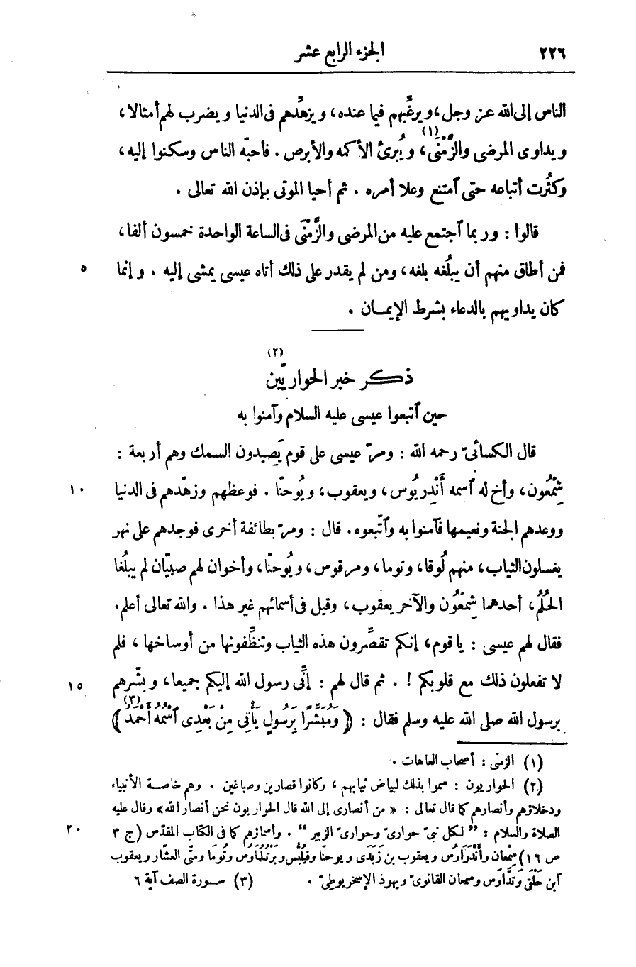 فقال لهم عيسى: يا قوم، إنكم تقصّرون هذه الثياب وتنظّفونها من أوساخها، فلم لا تفعلون ذلك مع قلوبكم!. ثم قال لهم: إنّى رسول الله إليكم جميعا، وبشرّهم برسول الله صلى الله عليه وسلم فقال: وَمُبَشِّراً بِرَسُولٍ يَأْتِي مِنْ بَعْدِي اسْمُهُ أَحْمَدُ «3»