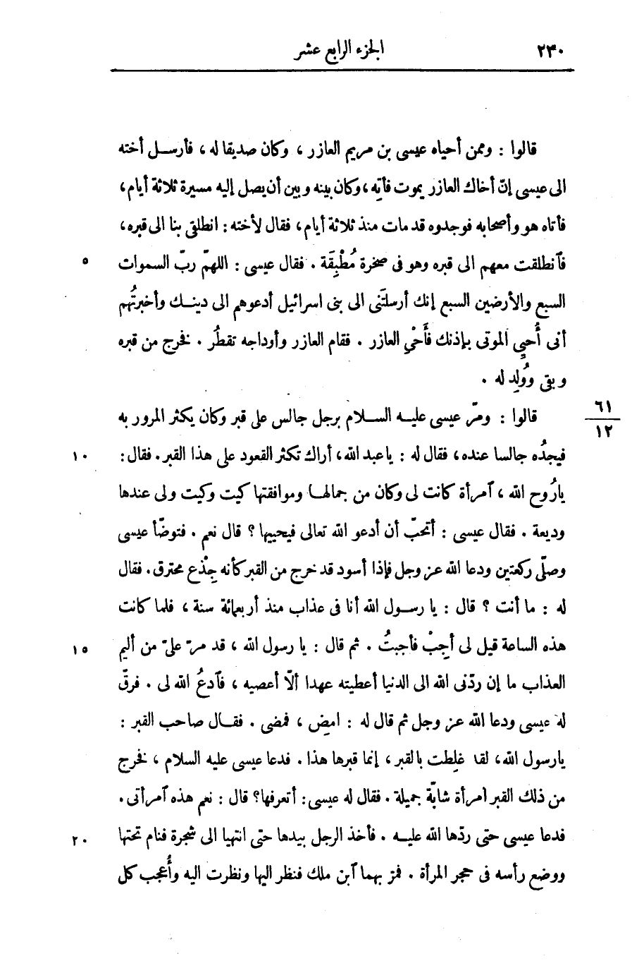 يا روح الله، امرأة كانت لى وكان من جمالها وموافقتها كيت وكيت ولى عندها وديعة. فقال عيسى: أتحبّ أن أدعو الله تعالى فيحييها؟ قال نعم. فتوضّأ عيسى وصلّى ركعتين ودعا الله عز وجل فإذا أسود قد خرج من القبر كأنه جذع محترق. فقال له: ما أنت؟ قال: يا رسول الله أنا فى عذاب منذ أربعمائة سنة، فلما كانت هذه الساعة قيل لى أجب فأجبت. ثم قال: يا رسول الله، قد مرّ علىّ من أليم العذاب ما إن ردّنى الله الى الدنيا أعطيته عهدا ألّا أعصيه، فادع الله لى. فرقّ له عيسى ودعا الله عز وجل ثم قال له: امض، فمضى. فقال صاحب القبر: