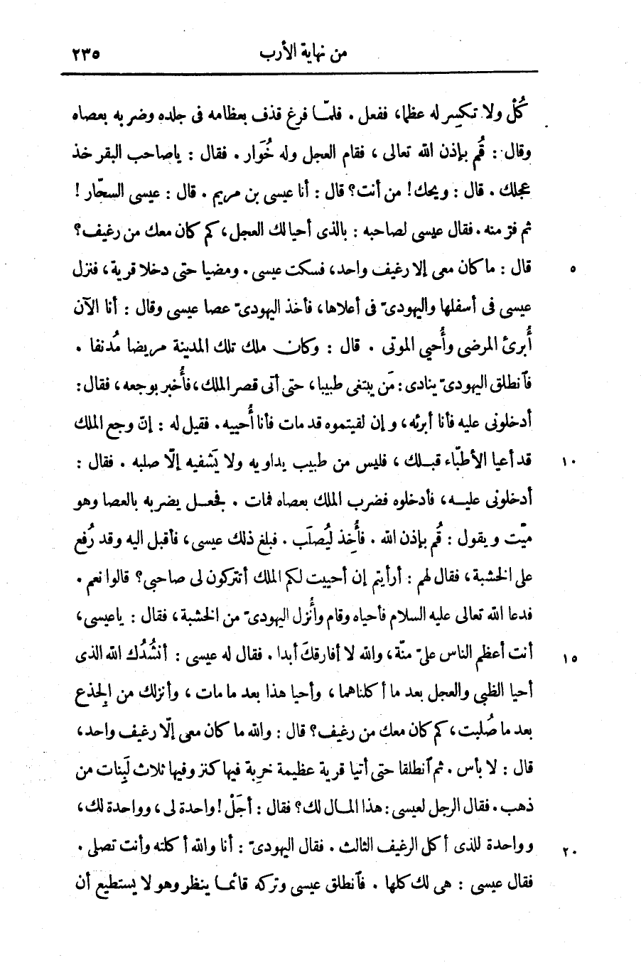 كل ولا تكسر له عظما، ففعل. فلمّا فرغ قذف بعظامه فى جلده وضربه بعصاه وقال: قم بإذن الله تعالى، فقام العجل وله خوار. فقال: يا صاحب البقر خذ عجلك. قال: ويحك! من أنت؟ قال: أنا عيسى بن مريم. قال: عيسى السحّار! ثم فرّ منه. فقال عيسى لصاحبه: بالذى أحيا لك العجل، كم كان معك من رغيف؟