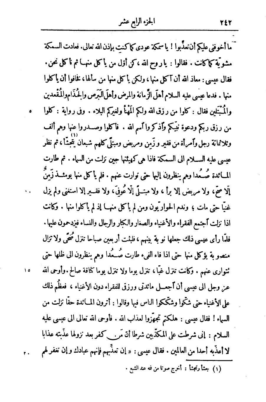 ما أخوفنى عليكم أن تعذّبوا! يا سمكة عودى كما كنت بإذن الله تعالى. فعادت السمكة مشويّة كما كانت. فقالوا: يا روح الله، كن أوّل من يأكل منها ثم نأكل نحن.
